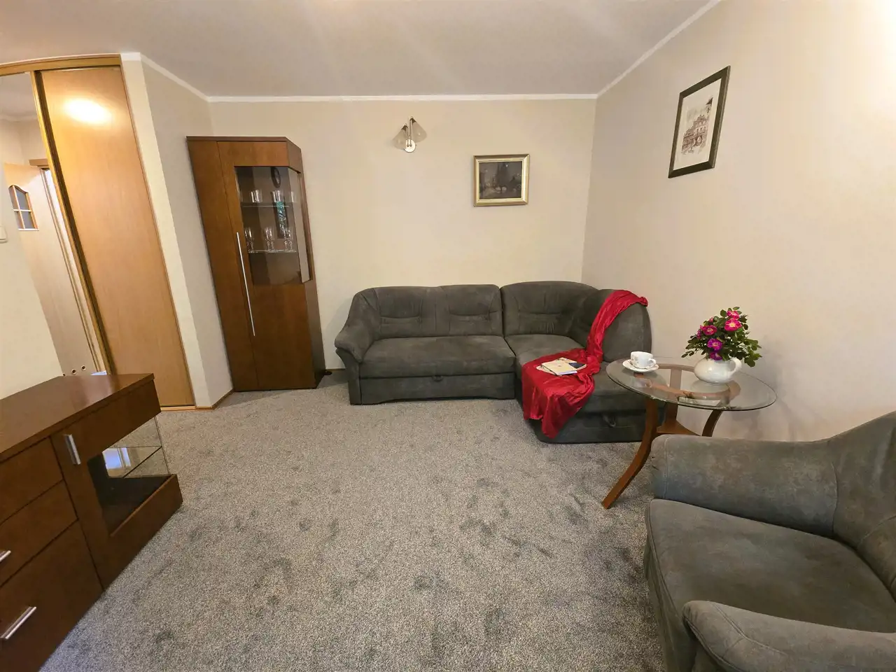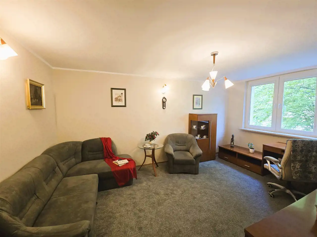 Pokój w pełni umeblowany: kanapa narożna, fotel, stół, komoda, dwie szafki przeszklone, burko, fotel biurowy, stolik pod telewizor, (możliwość wstawienia telewizora). Łazienka: kabina prysznicowa, umywalka, pralka automatyczna). Mieszkanie czyste i odświeżone, do zamieszkania od zaraz.