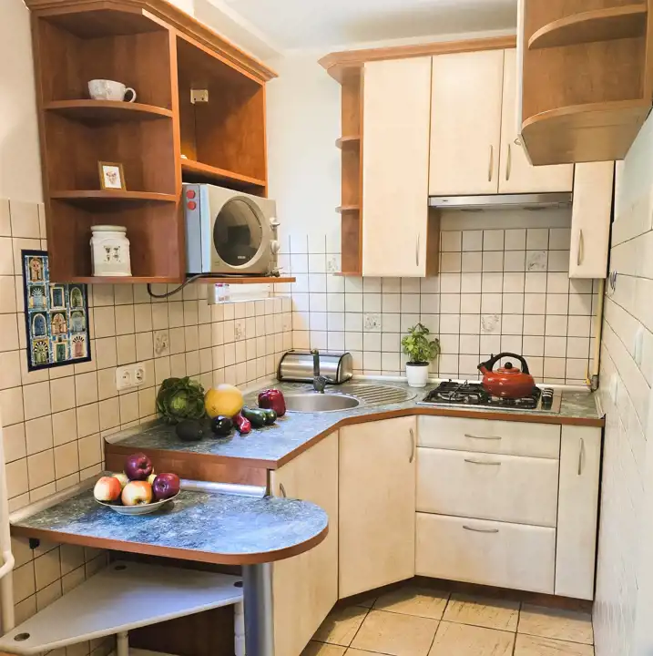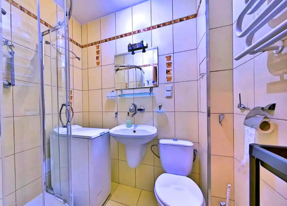 Mieszkanie bardzo ciche, z widokiem na podwórko z dużą ilością zieleni, dobrze wyposażone. Kuchnia: meble kuchenne lodówka, mikrofalówka, kuchnia gazowa, pochłaniacz zapachów (bez zmywarki).