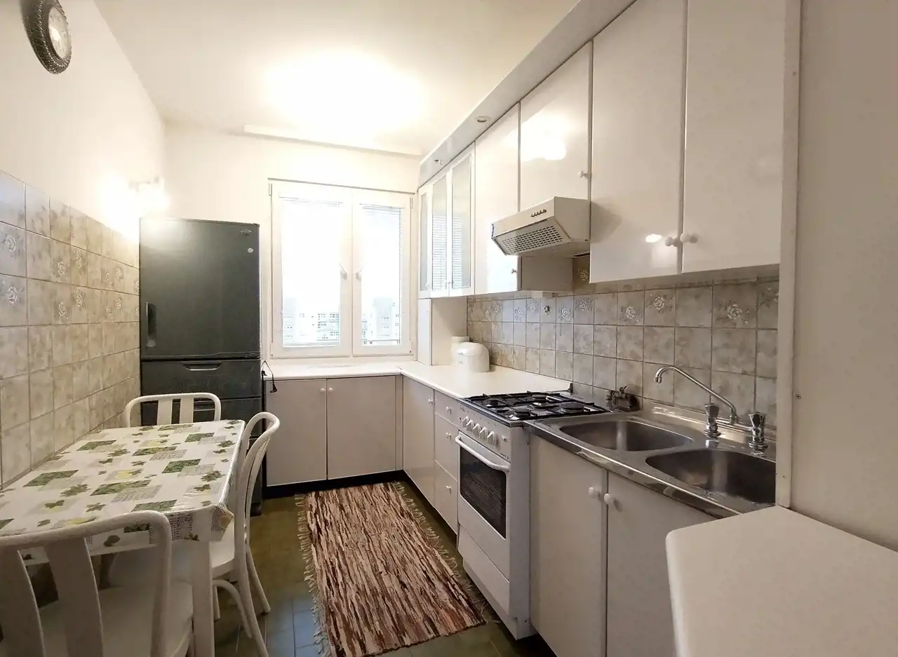 Lokal ma powierzchnię 46.1 mkw, jest narożny i rozkładowy; składa się z 2 oddzielnych pokoi pow. ok. 18 i 9mkw, oddzielnej widnej kuchni ponad prawie 8 mkw, łazienki z toaletą ok. 3mkw oraz przedpokoju. Z większego pokoju wyjście na balkon prawie 2 mkw i przyjemny widok na zieleń. Mieszkanie jest umeblowane i wyposażone: stół z krzesłami, telewizor, łazienka ewentualnie z pralką, z wanną. Dodatkowo pojemne szafy w przedpokoju. W kuchni szafki, chłodziarko - zamrażarka i kuchenka gazowa z piekarnikiem. Jest możliwość umieszczenia w mieszkaniu jednej lub dwóch rozkładanych kanap.
