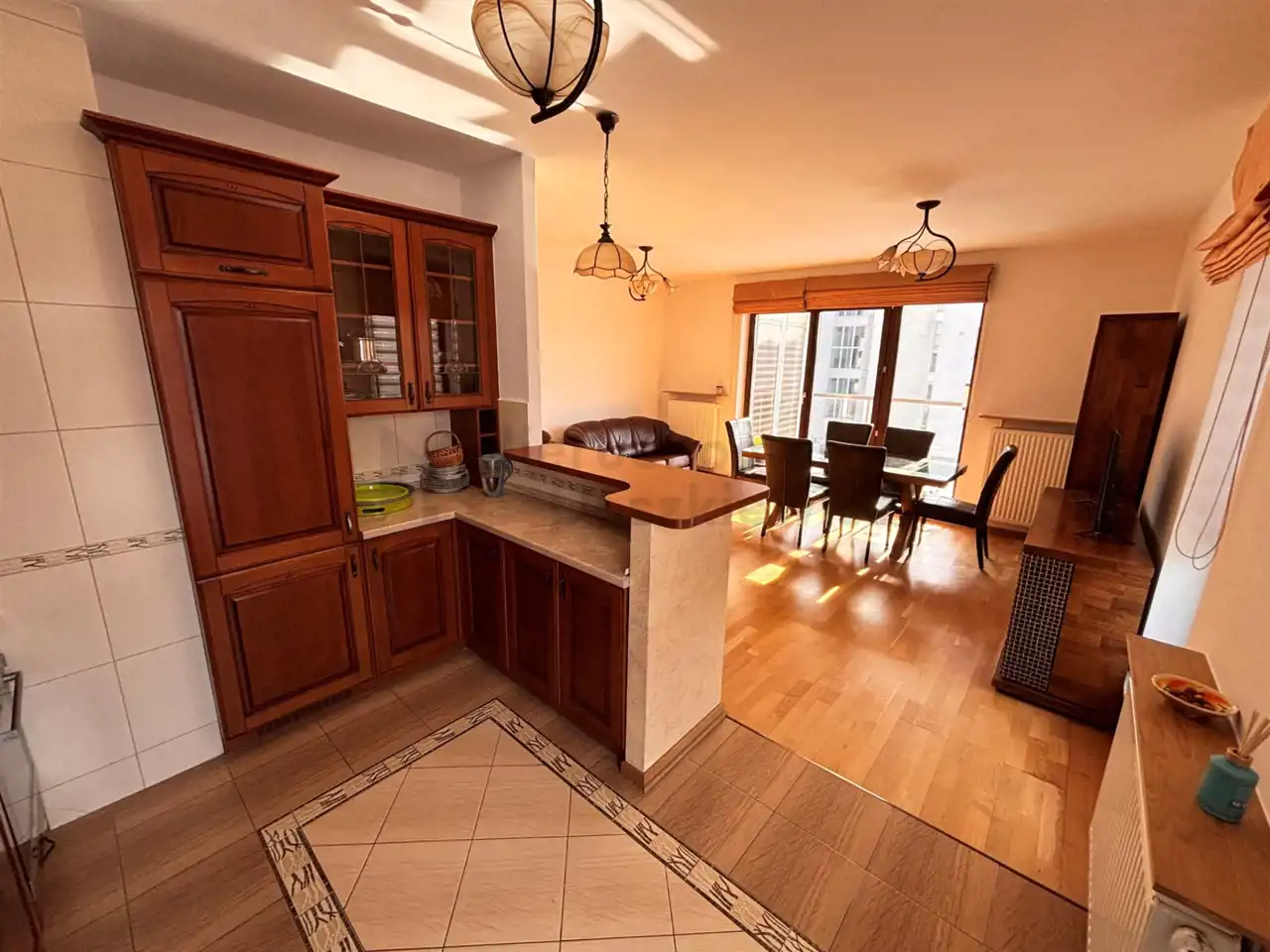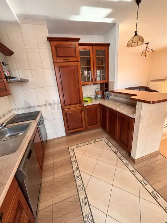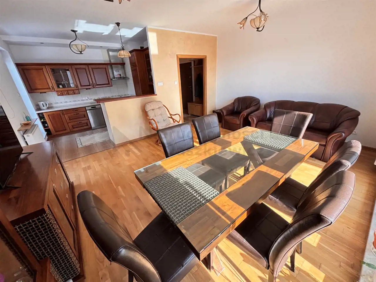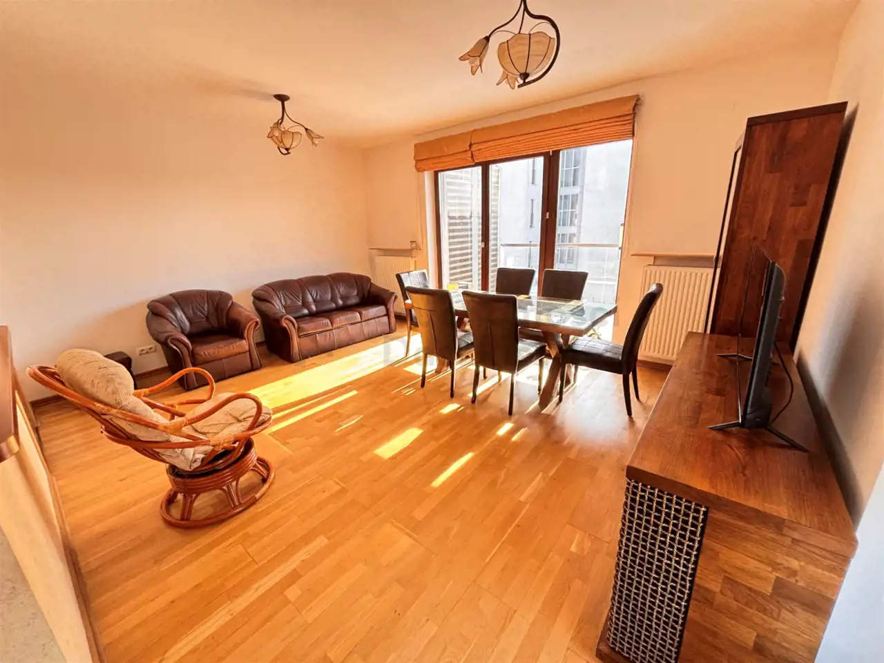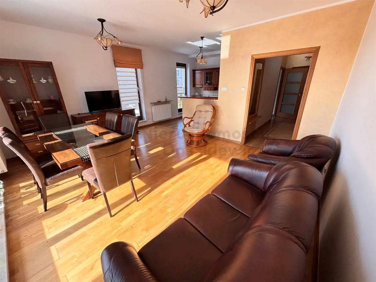 Pokój dzienny o pow. 21.5m otwarty na kuchnię 9m – na podłodze panele drewniane, na wyposażeniu skórzana sofa i fotel, fotel wiklinowy, stół z krzesłami, witryna i komoda z TV (wystawa okien w kierunku południowym i zachodnim). Z pokoju wyjście na słoneczny balkon o pow. 6.5m.