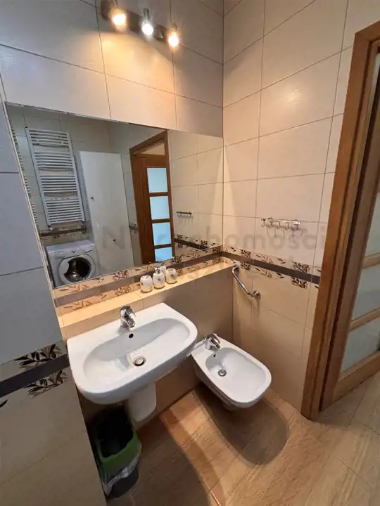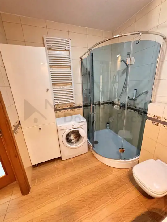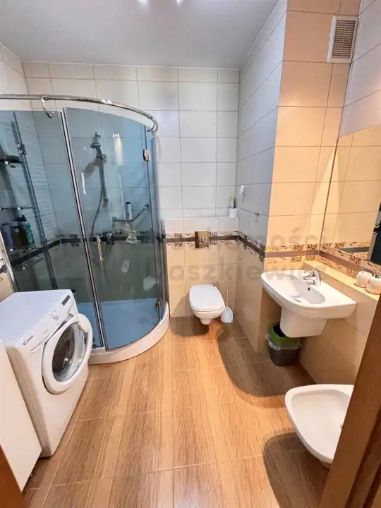 Łazienka o pow. 5.2m – terakota, glazura, kabina prysznicowa, umywalka, wc, bidet, duża szafa łazienkowa i pralka.