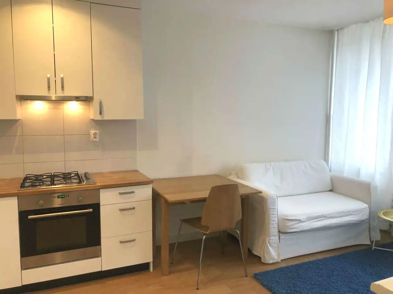 Duży pokój z aneksem kuchennym (pełne wyposażenie w meble i sprzęt AGD) z wejściem do małej sypialni z oknem. Mieszkanie jasne, przestronne. Loggia od strony zachodniej.