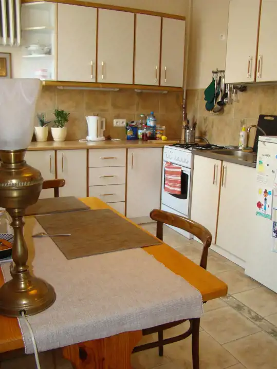 Mieszkanie jest umeblowane (fotel, kanapa, stół, krzesła, stylowy bufet, komoda) i wyposażone w lodówkę i pralkę. W przedpokoju znajduje się pojemna szafa garderobiana.