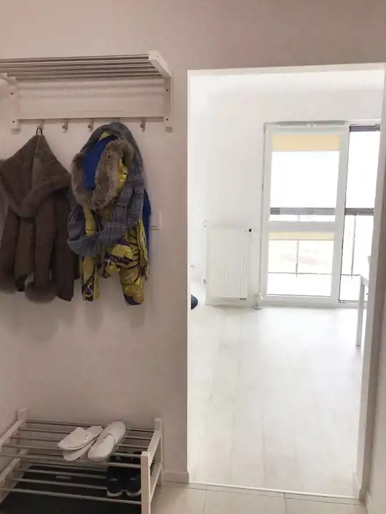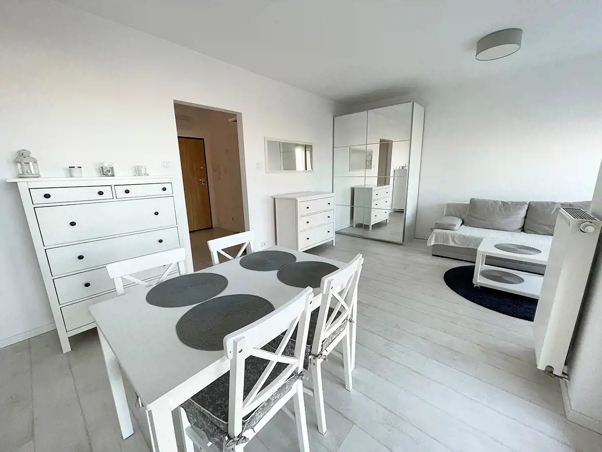 Mieszkanie składa się z pokoju dziennego umeblowanego w rozkładaną sofę, szafę, 2x komodę, stół z krzesłami oraz z wyjściem na balkon.