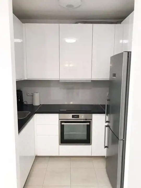 Kuchnia jest oddzielna w zabudowie z pełnym AGD (lodówka, zmywarka, piekarnik, płyta elektryczna, okap kuchenny).