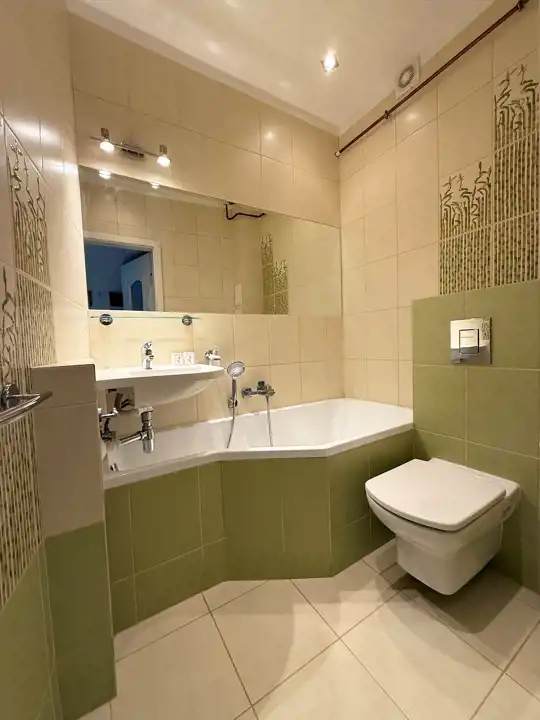 Łazienka wyposażona w wannę, umywalkę i WC.