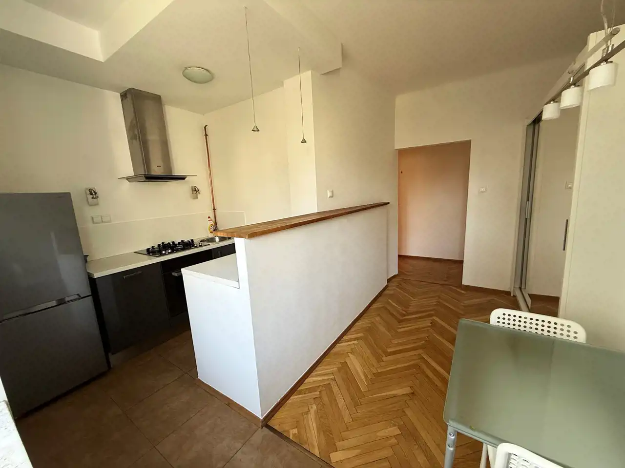 Mieszkanie składa się z oddzielnej, widnej kuchni w zabudowie z AGD (lodówka, zmywarka, płyta gazowa, okap kuchenny, pralka).