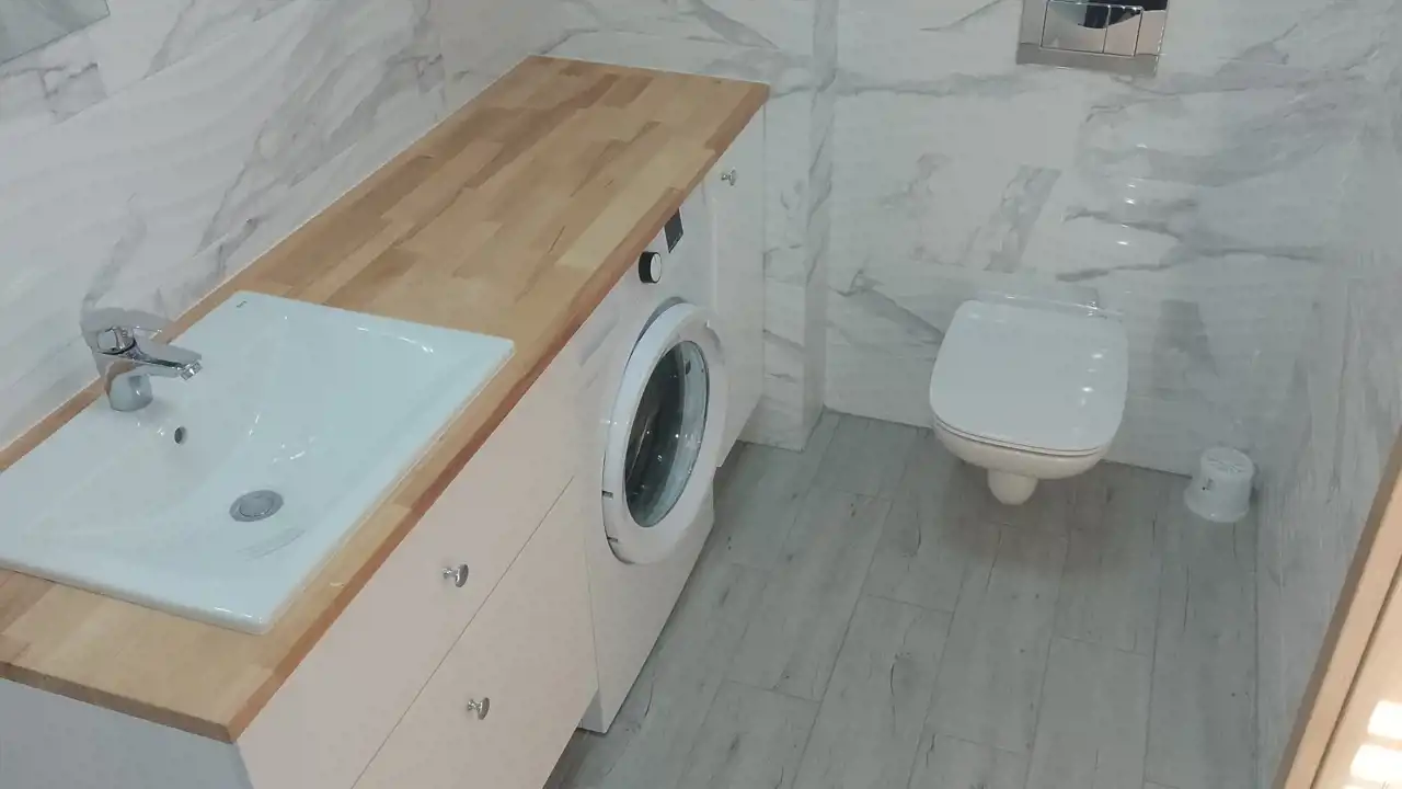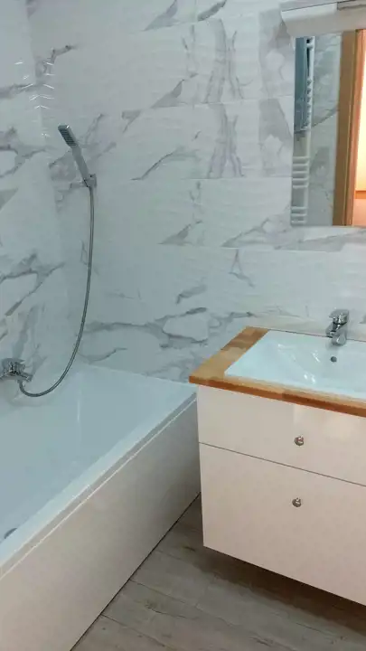 W sypialni jest duże, wygodne łóżko. W łazience jest wanna,umywalka z nową armaturą,sedes i szafki.