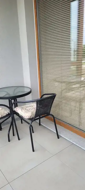 W salonie jest wygodna sofa, stół,siedziska, szafka na telewizor i szafa Z pokoju dziennego jest wyjście na 4,4m2 loggię ze stolikiem i krzesłami.