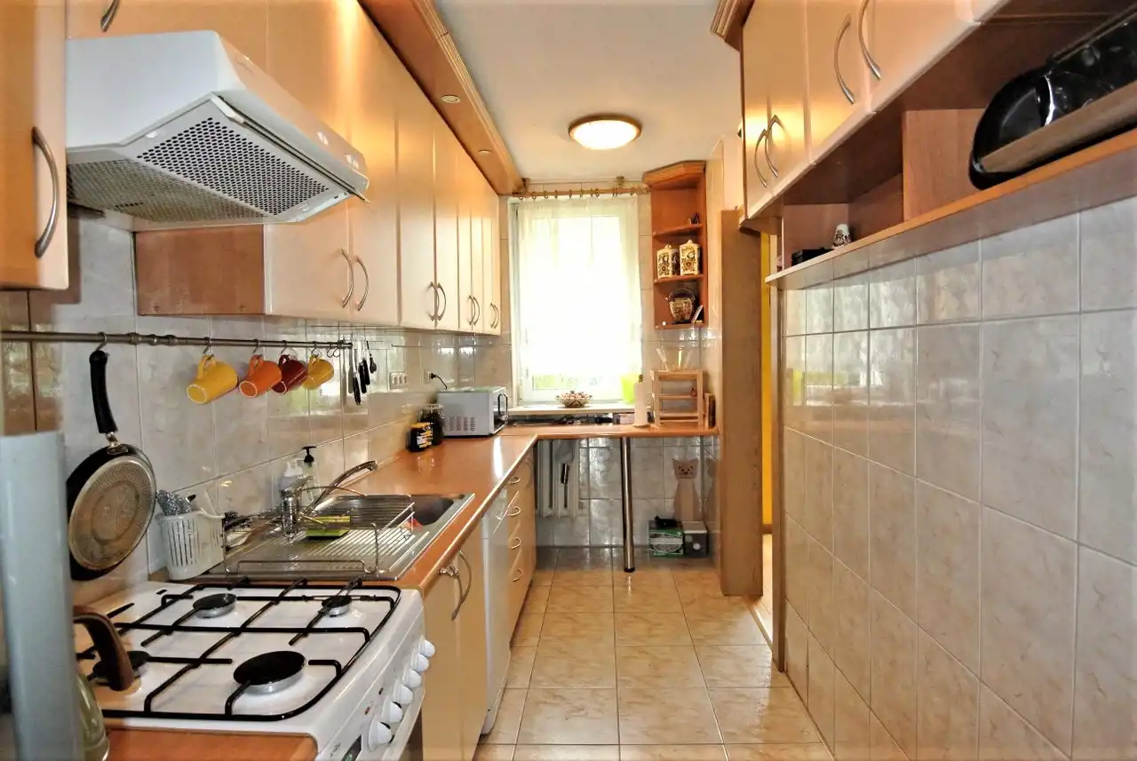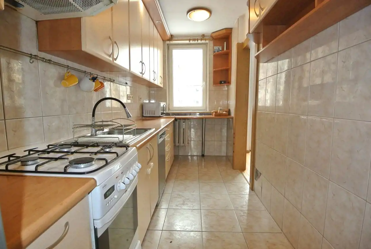 Lokal usytuowany jest na 1 piętrze w 10-piętrowym budynku z 1990 roku. Pomieszczenia: salon z wyjściem na balkon, 2 sypialnie, kuchnia, łazienka, WC, przedpokój. Ekspozycja okien: wschód, zachód. Mieszkanie wyposażone w sprzęt AGD (lodówka, zmywarka, piekarnik, kuchenka gazowa, pralka).