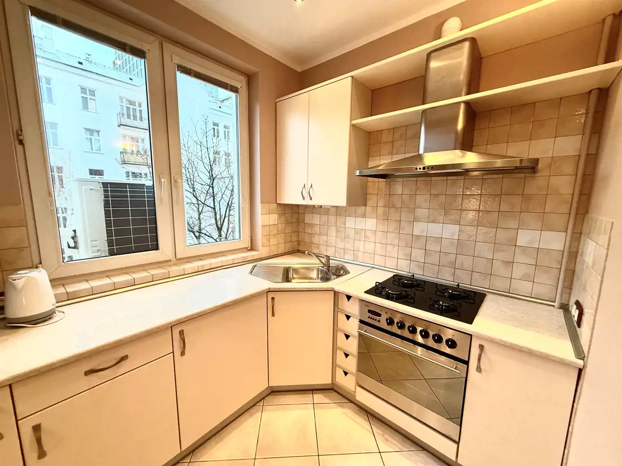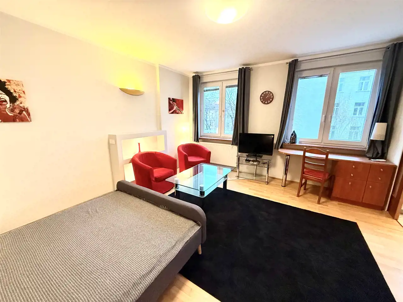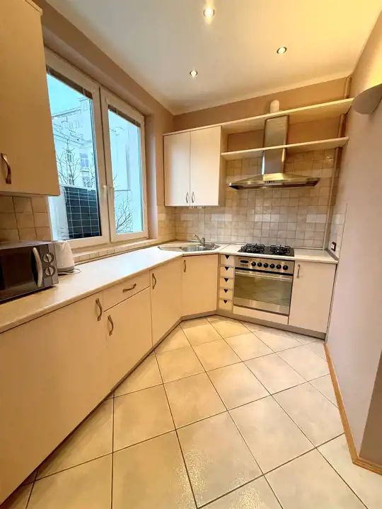 The flat is situated in a 4-storey historic tenement building (kamienica) with a lift, and located on the 3rd floor. It is fully furnished, functional, and includes air conditioning, which is a major advantage in the summer.