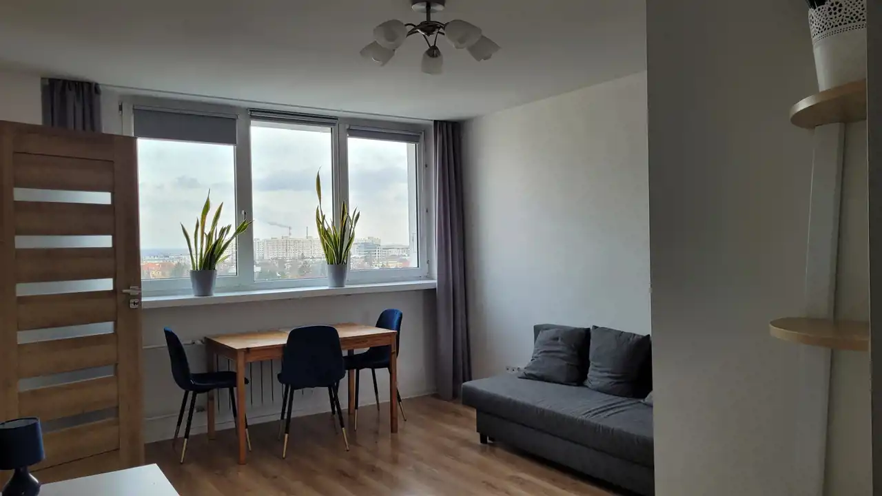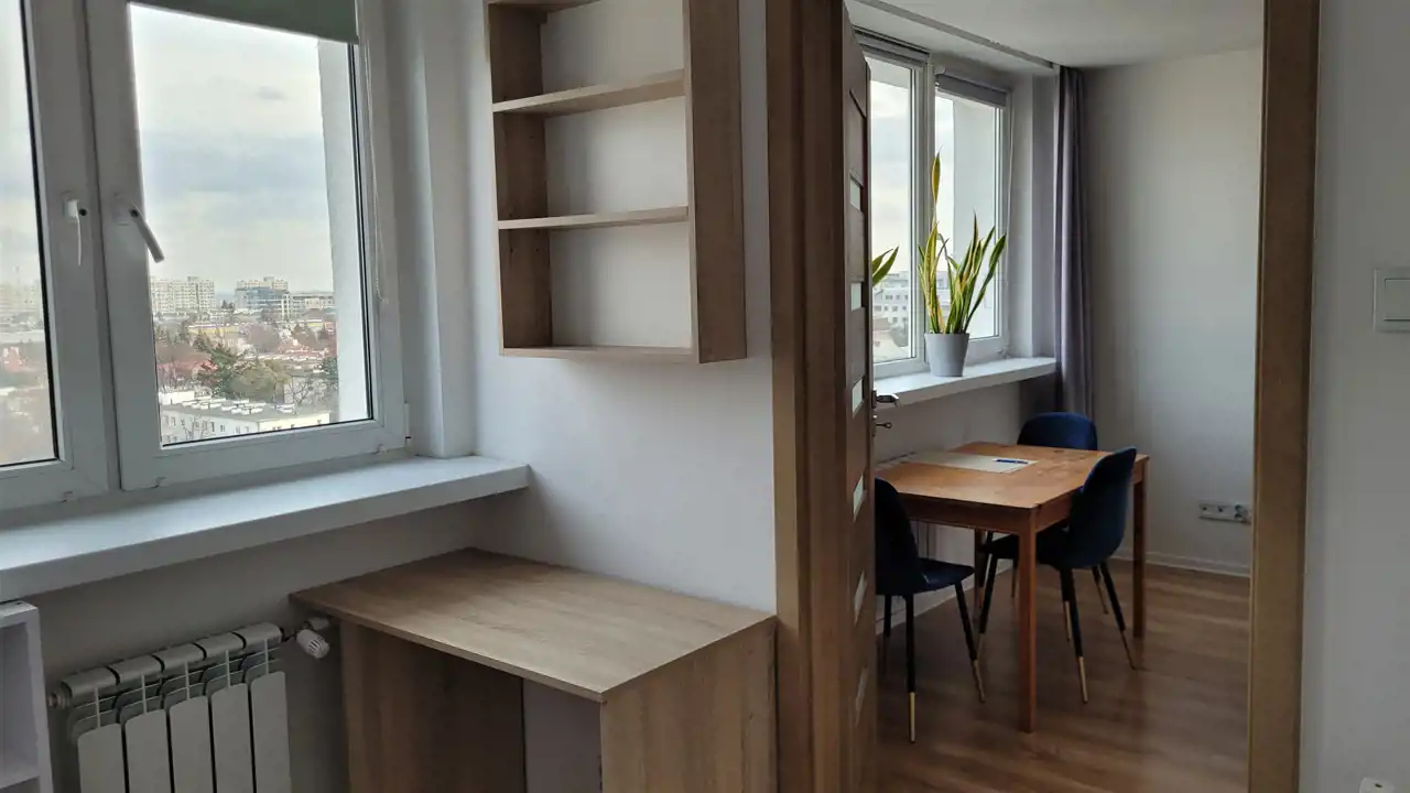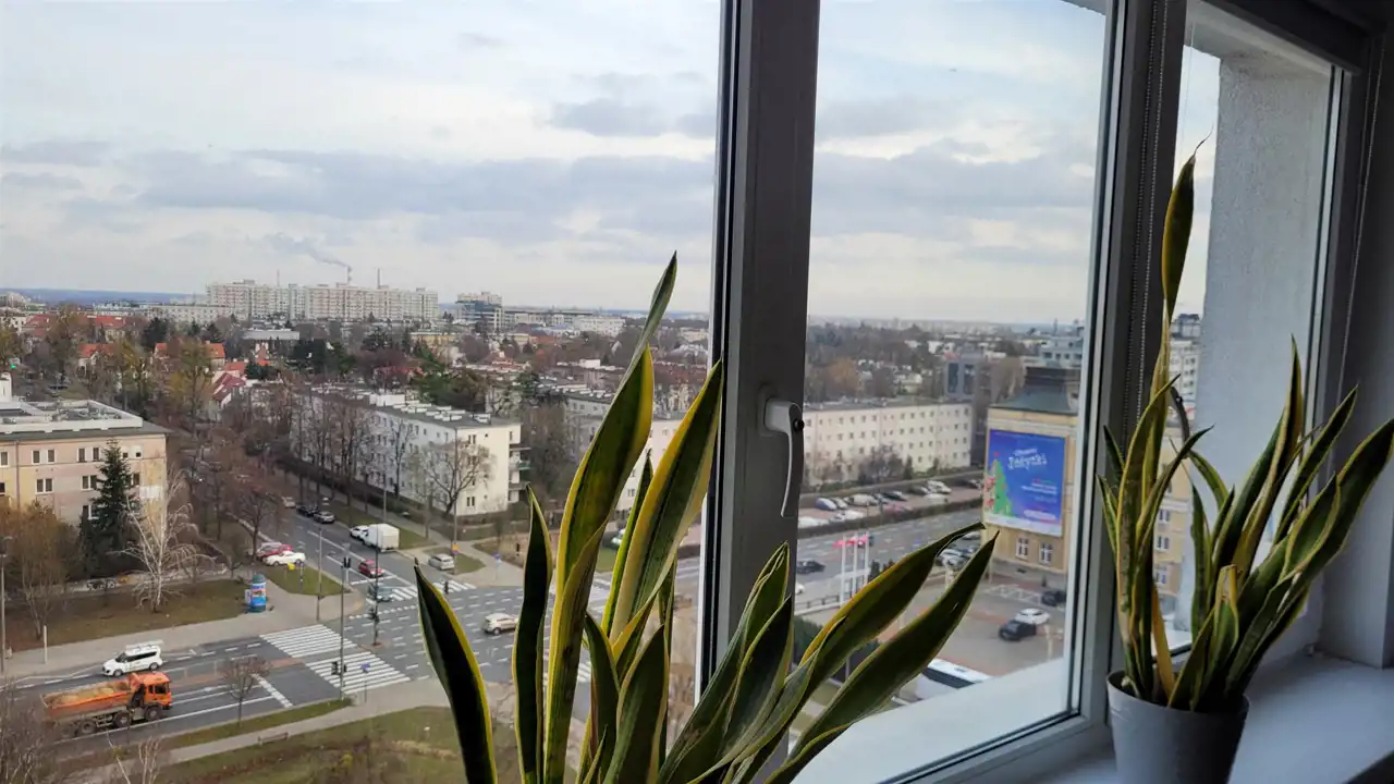 Mieszkanie jest słonecznym lokum, z widokiem na panoramę Warszawy .