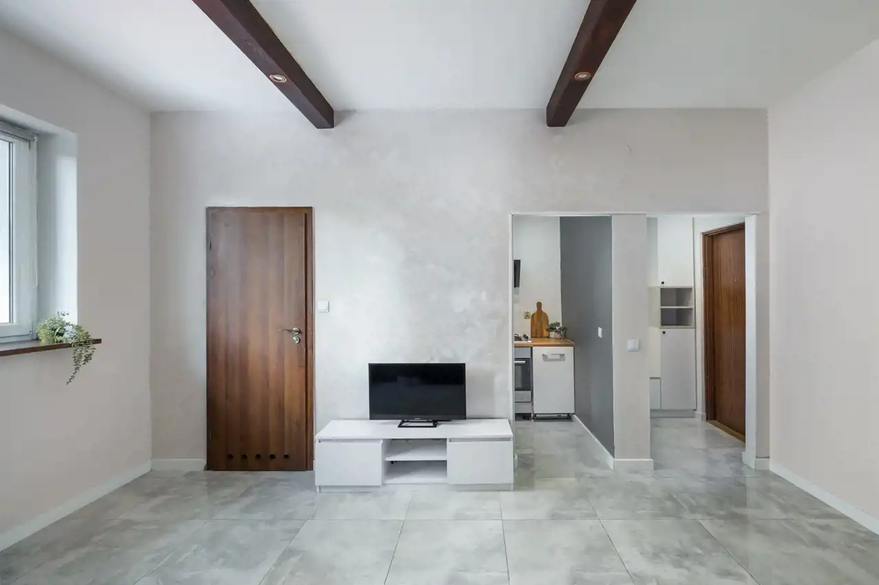 - przestronny salon – pełniący funkcję dziennej części mieszkania, idealny do wypoczynku lub pracy; jasne barwy i naturalne światło podkreślają przytulny charakter,