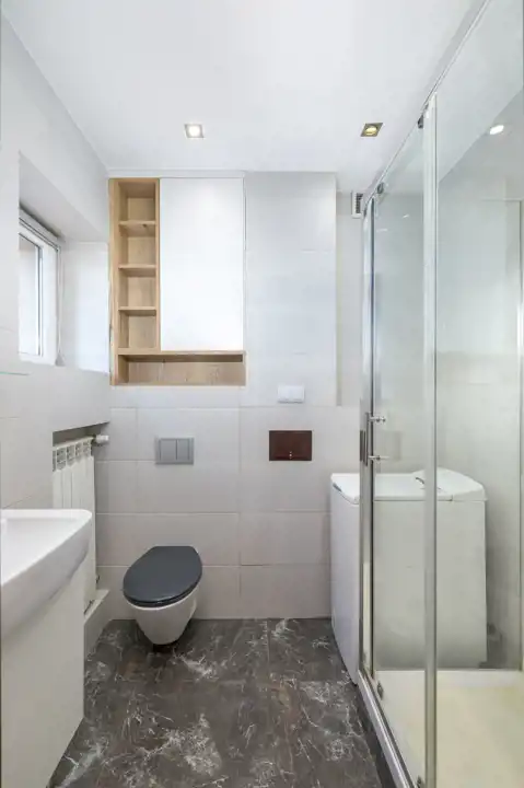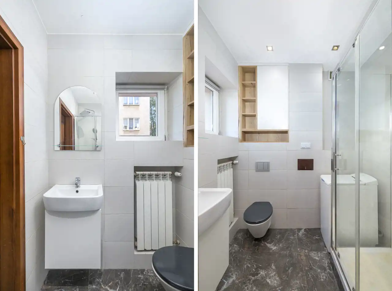- łazienka z prysznicem i WC – czysta, zadbana, utrzymana w klasycznej stylistyce.