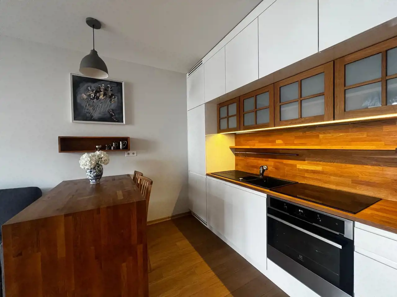 Kuchnia z zabudową z pełnym agd, mnóstwo szafek na przechowywanie.