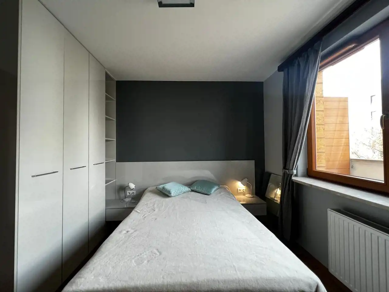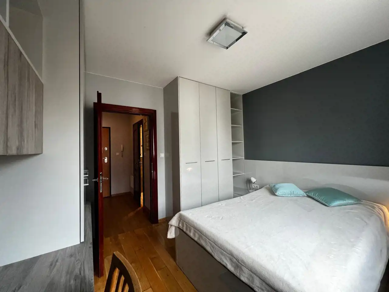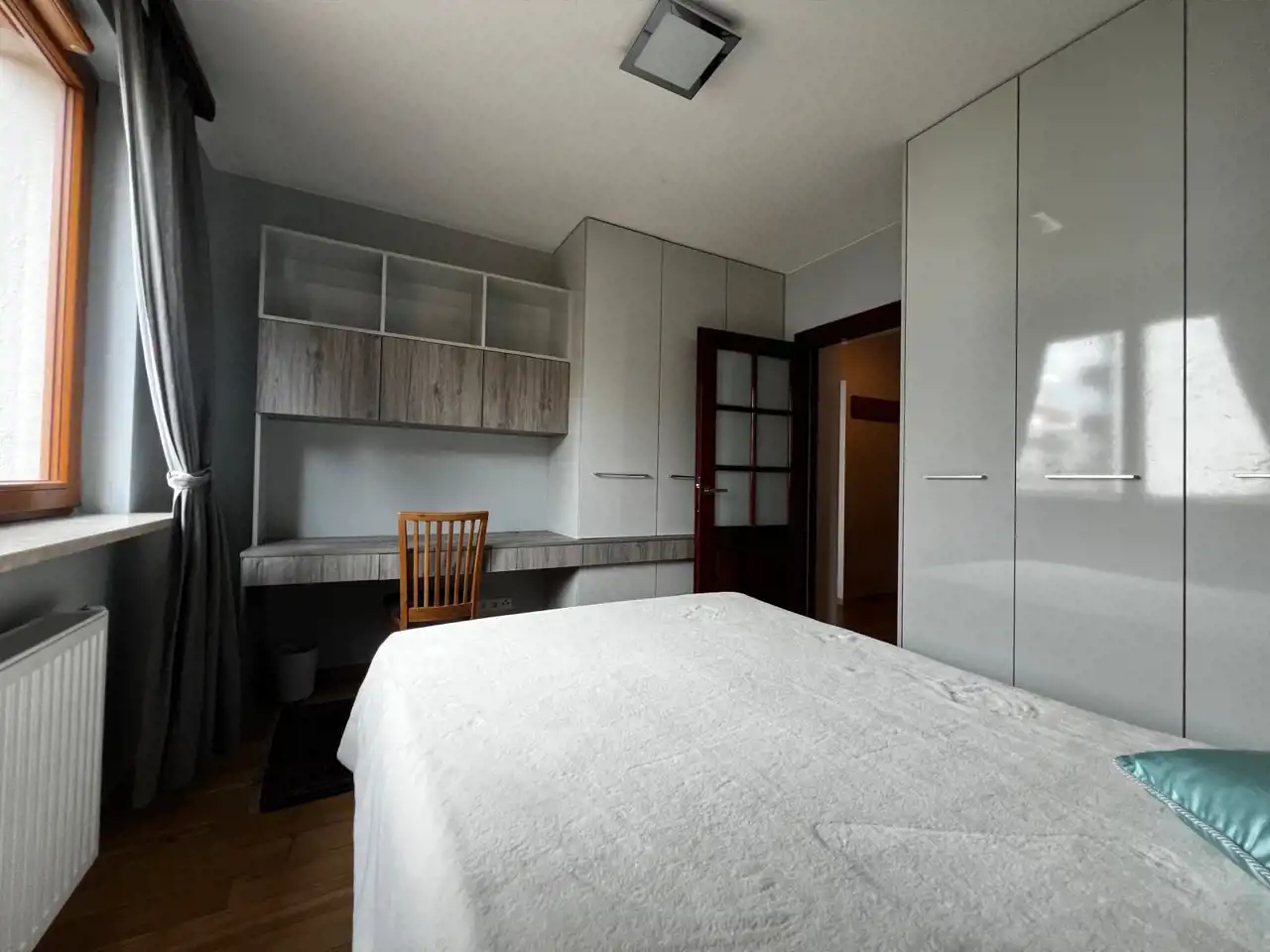 Sypialnia z podwójnym łóżkiem z zabudowana szafą wnękową oraz miejscem do pracy.