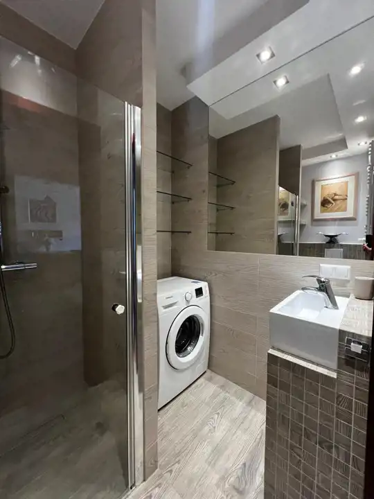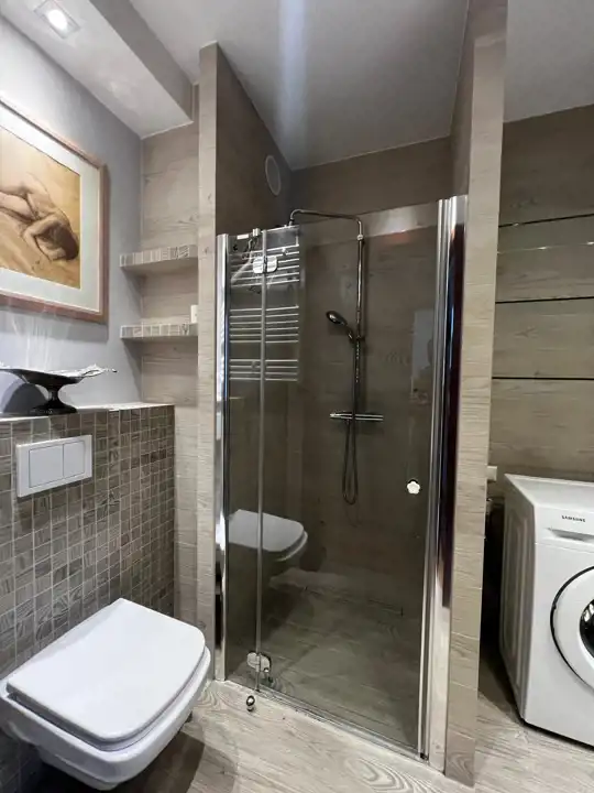 Łazienka z prysznice, pralka.