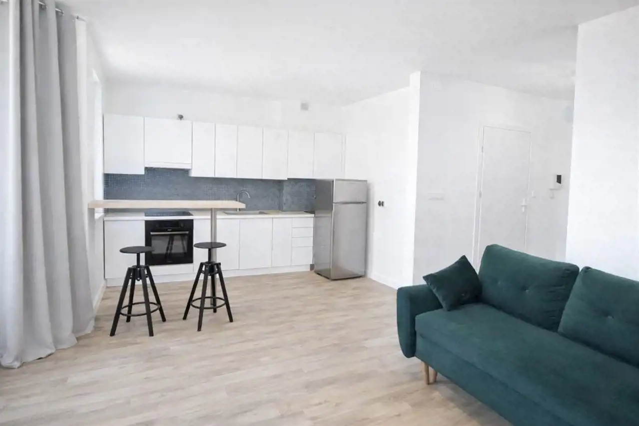 The apartment is fully furnished and equipped with household appliances (induction hob, oven, dishwasher, washing machine). The unit is located on the 13th floor of a 14-storey building from 2004. The apartment consists of: a living room with a kitchenette and access to the balcony, a bathroom with WC, and a hallway.