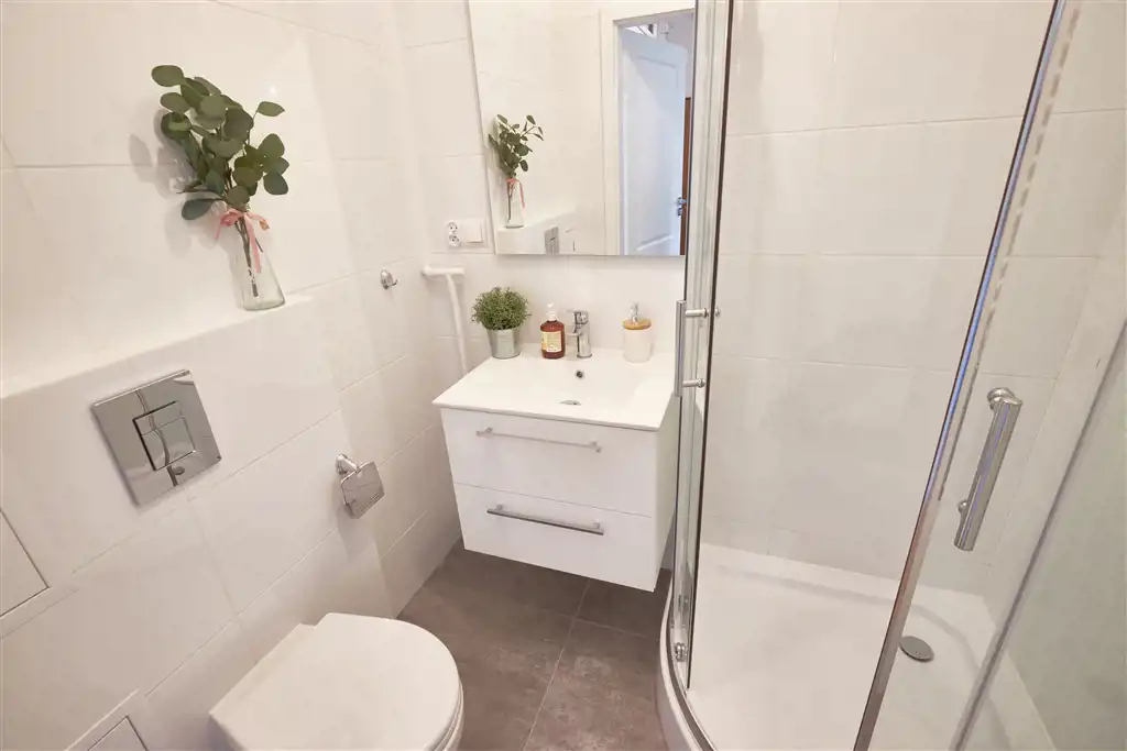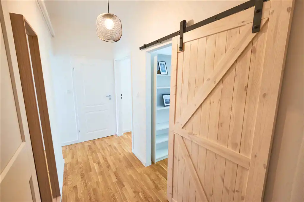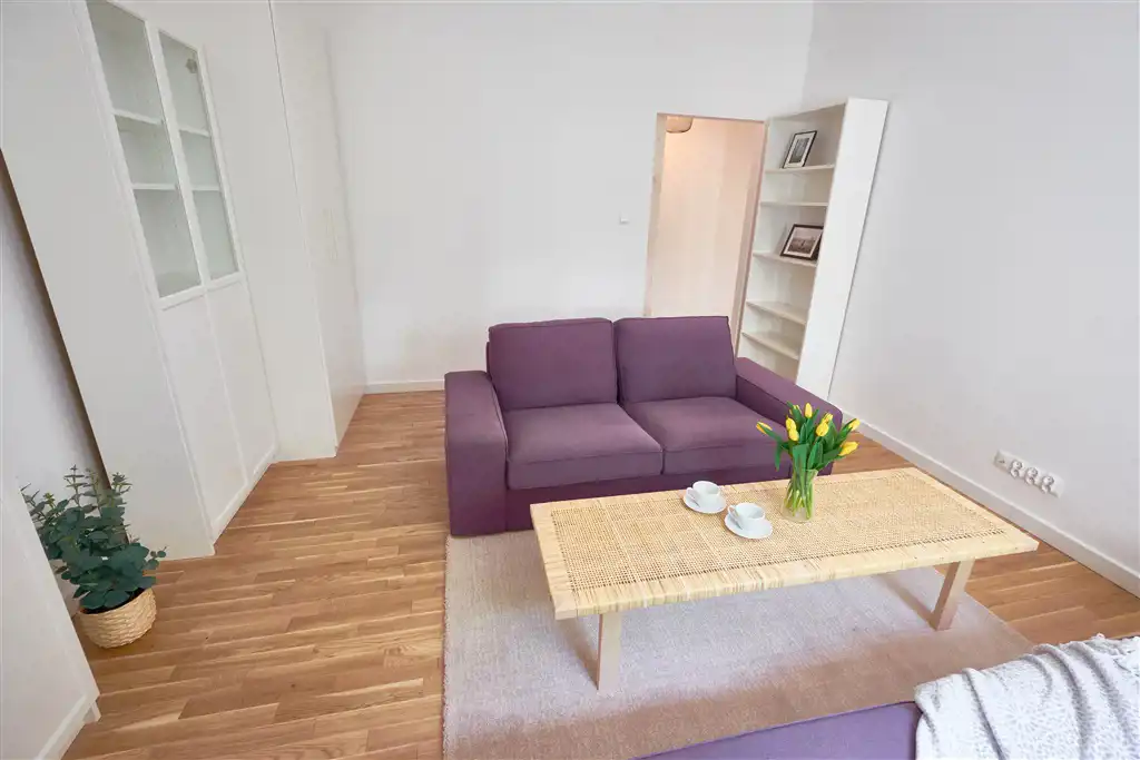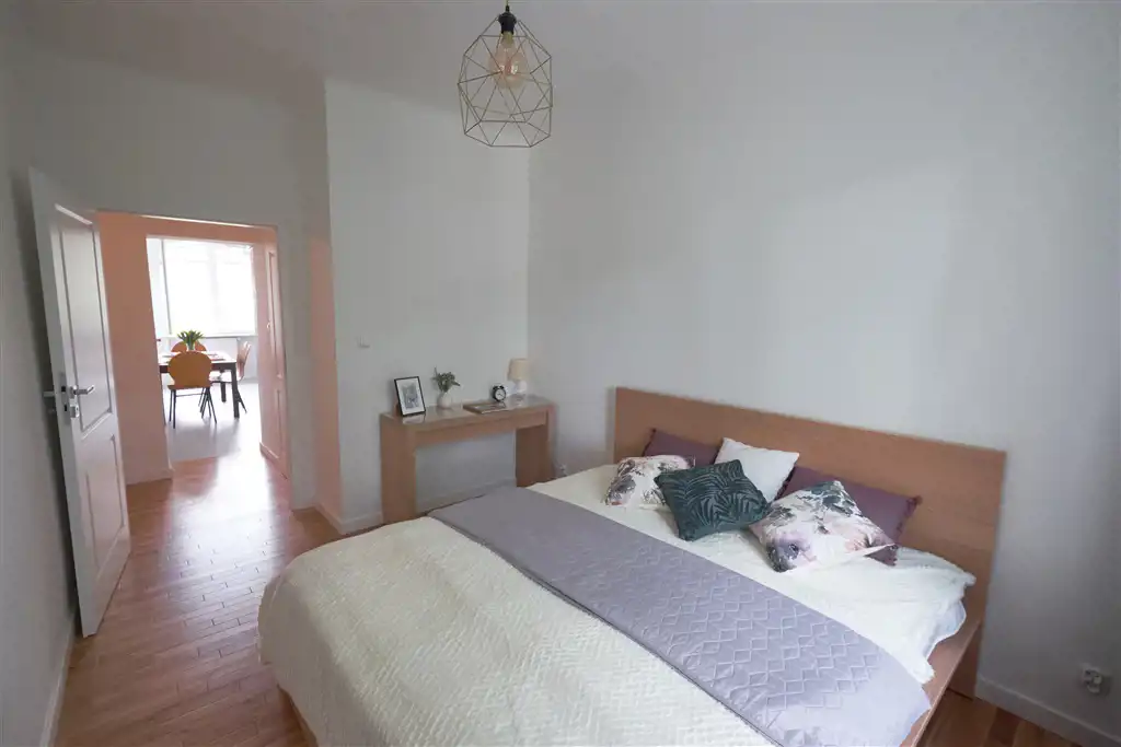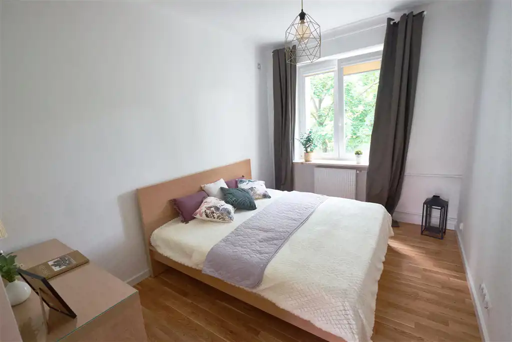Składa się z dwóch pokoi, oddzielnej widnej kuchni, łazienki z kabiną prysznicową i przedpokoju. Kuchnia w pełni wyposażona: pojemna lodówka, płyta grzewcza, mikrofala, zmywarka etc. W pokoju na podłogach piękny parkiet dębowy. Sypialnia z duży łóżkiem.