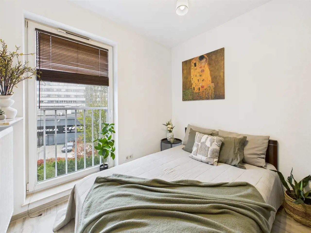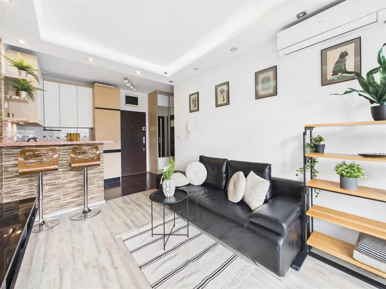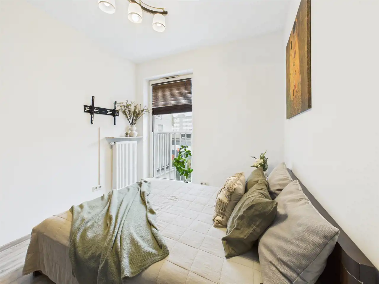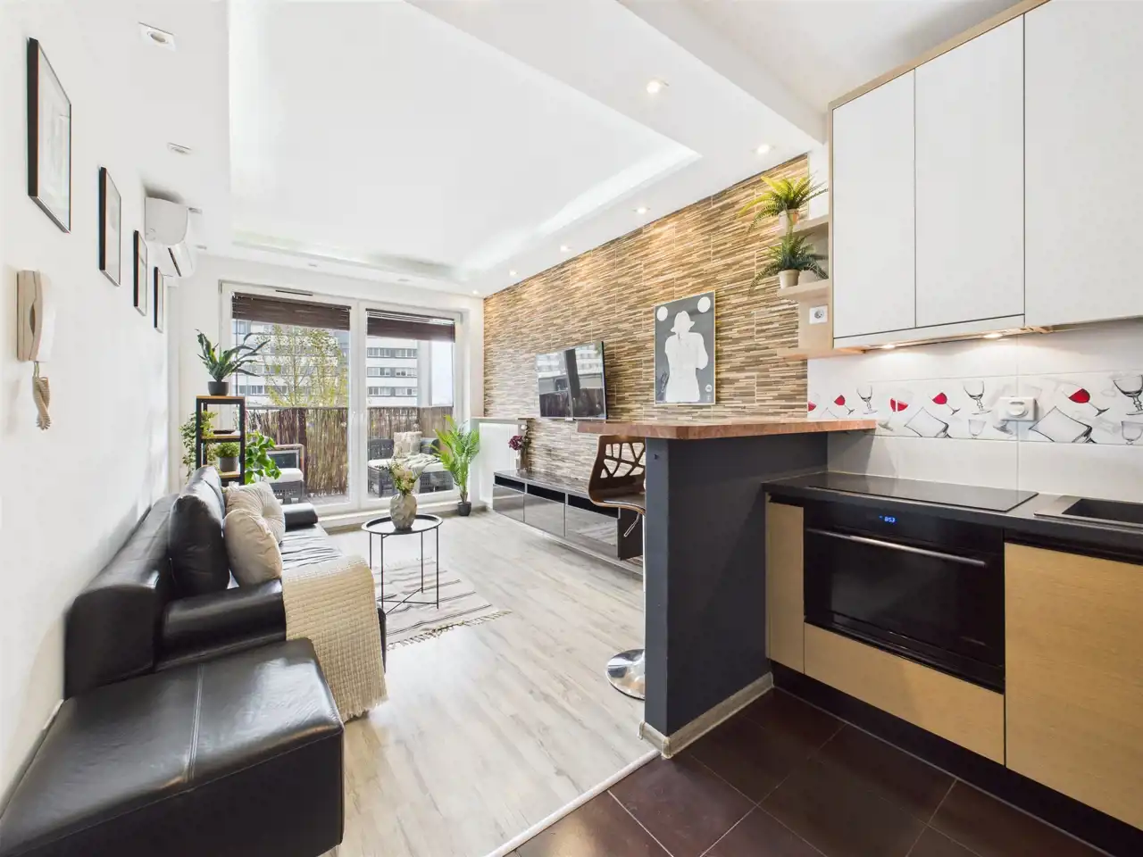 - Duży pokój z aneksem kuchennym oraz wyjściem na balkon;