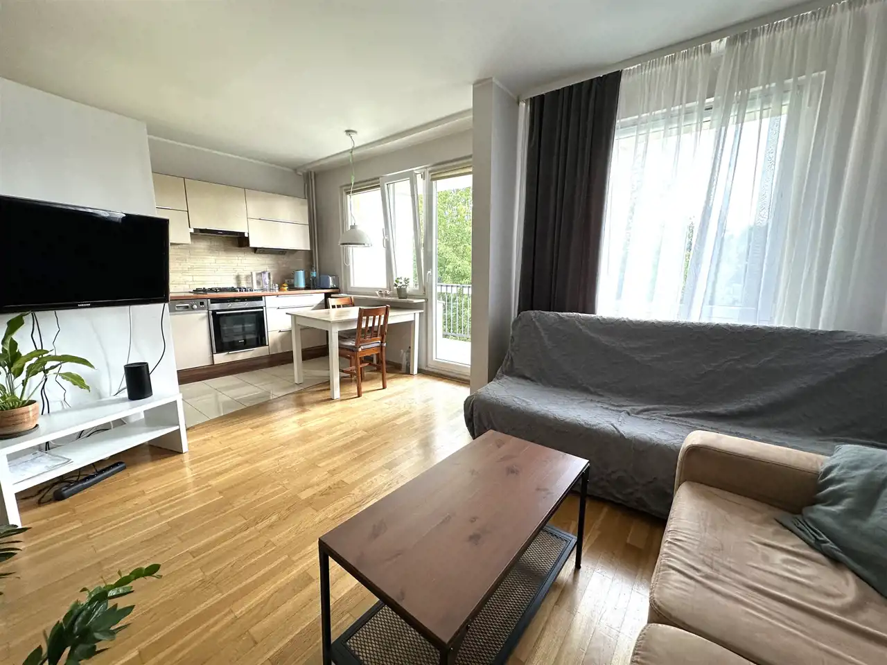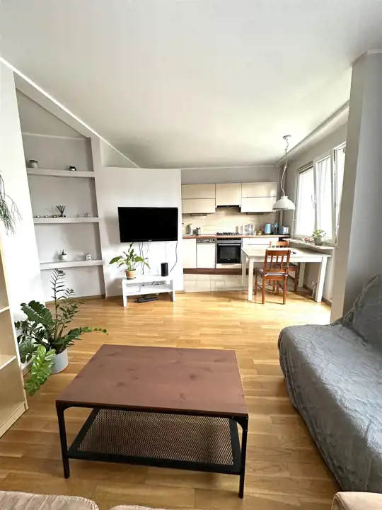- duży salon z aneksem kuchennym oraz wyjściem na balkon.
