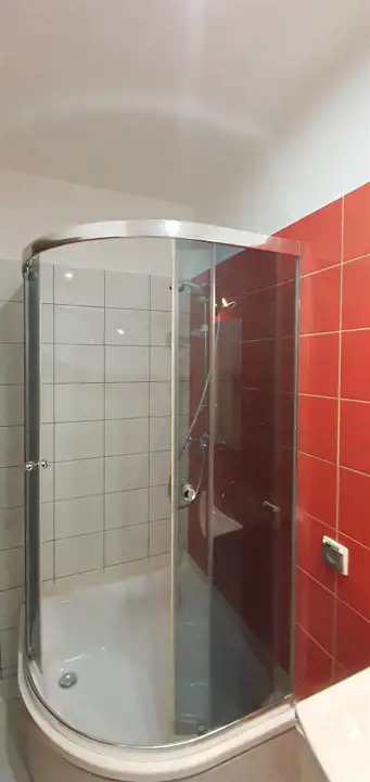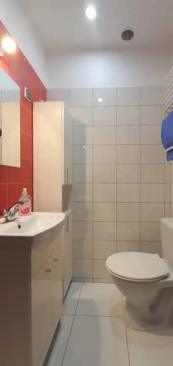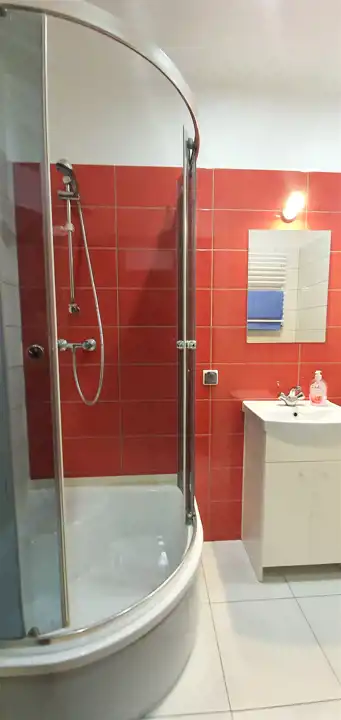 Przy wejściu do mieszkania znajduje się łazienka wyposażona w toaletę, umywalkę i prysznic. W przedpokoju wnęka na pralkę.