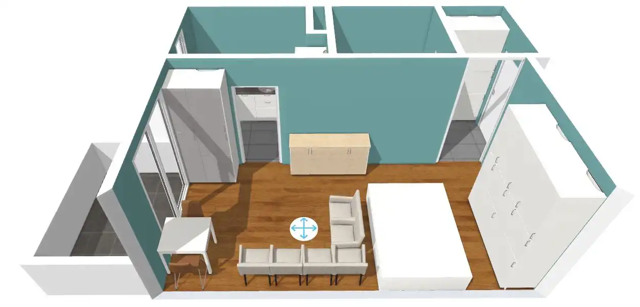 Składa się z pokoju dziennego 20 m2, kuchni 5 m2, łazienki 4 m2, oraz przedpokoju 2,6 m2 .