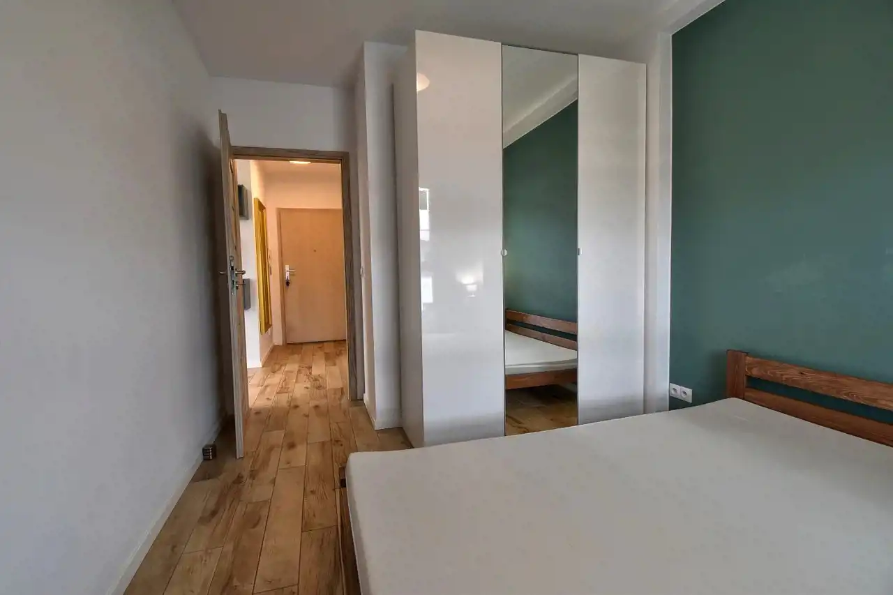 Mieszkanie umeblowane i wyposażone w sprzęt AGD (lodówka, piekarnik, zmywarka, płyta indukcyjna, pralka). Pomieszczenia: salon z aneksem kuchennym, balkon, sypialnia, łazienka z WC, przedpokój, garderoba.