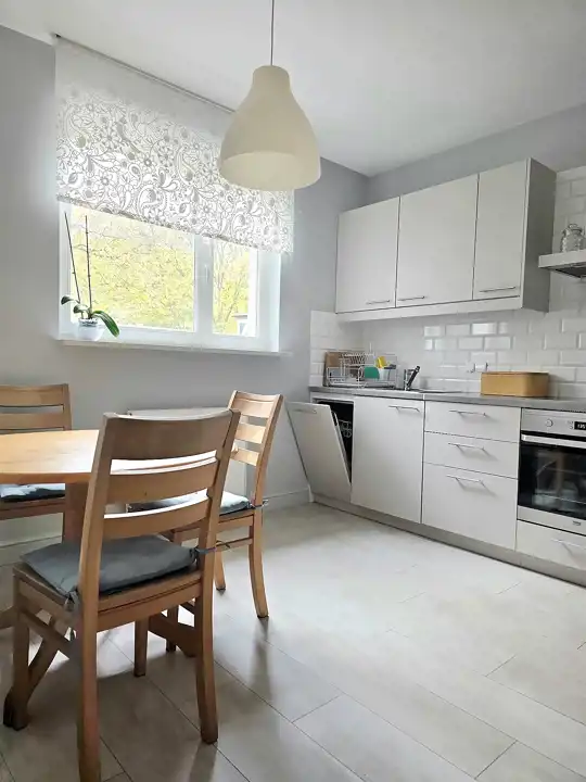 Wspaniała duża jasna kuchnia ze stołem i krzesłami, wyposażona w sprzęt AGD z nową lodówką), płytą indukcyjną, piekarnikiem, wyciągiem, zmywarką do naczyń.