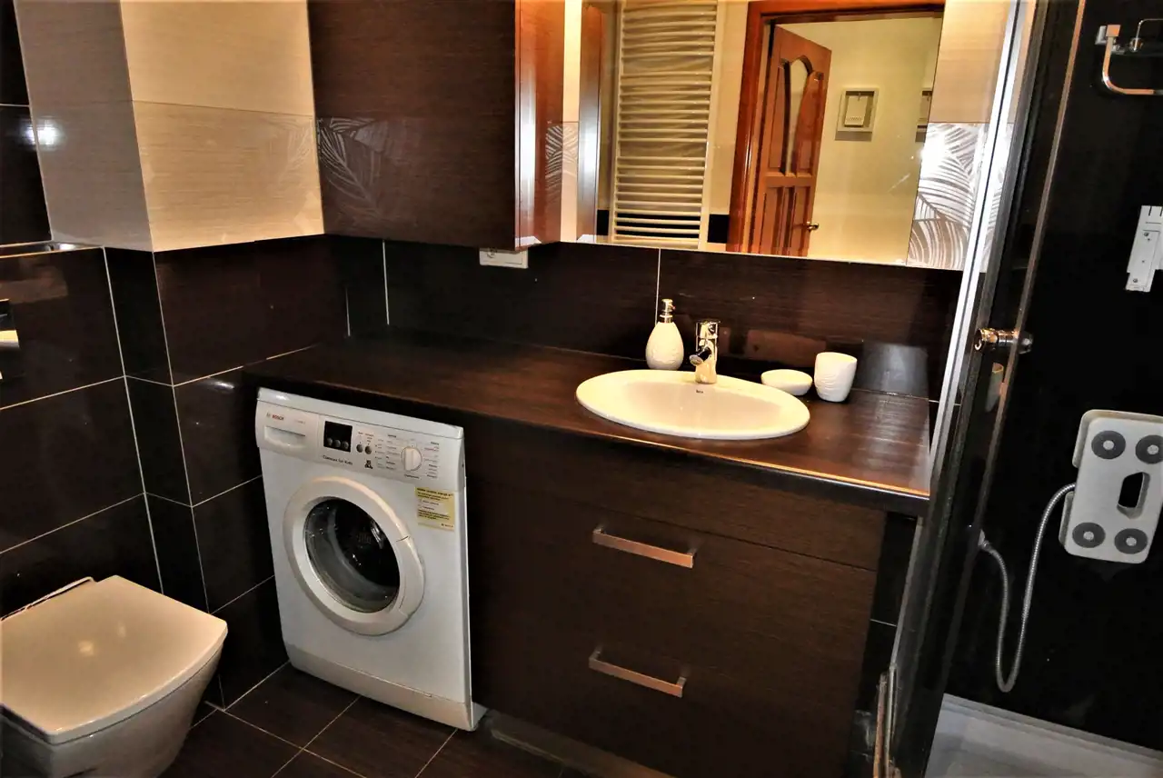 - łazienki połączonej z WC (do dyspozycji najemcy umywalka, prysznic, szafki do przechowywania i pralka).