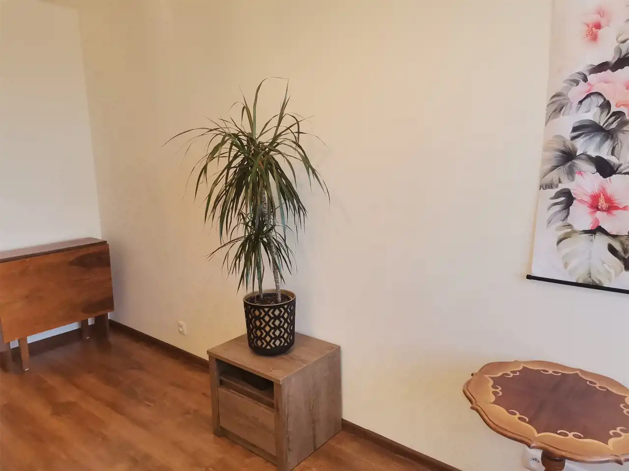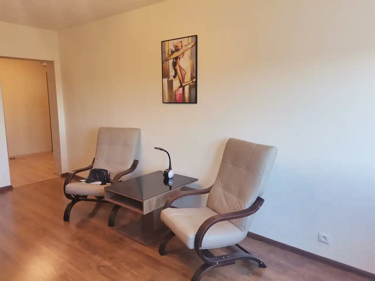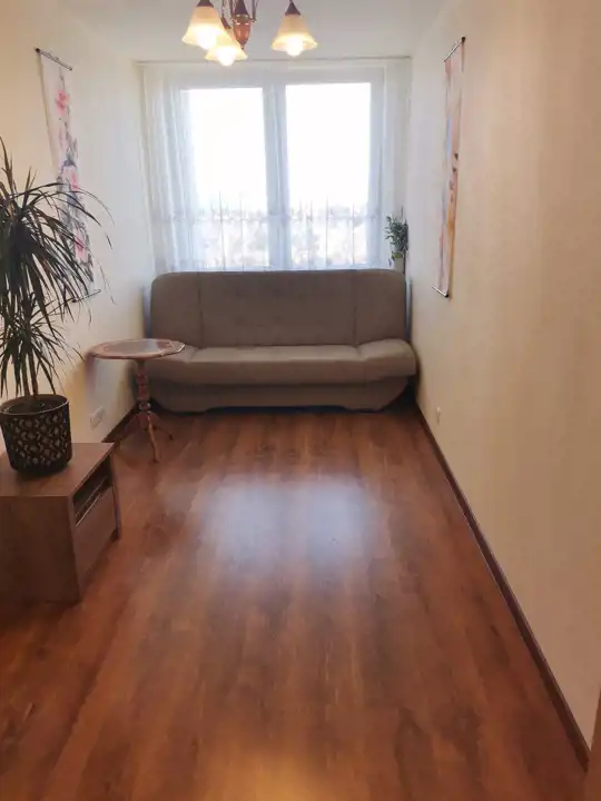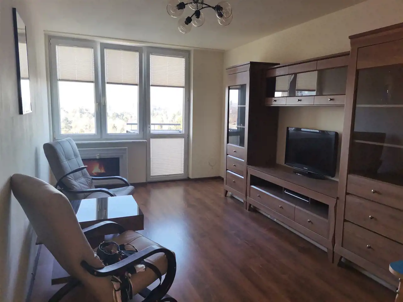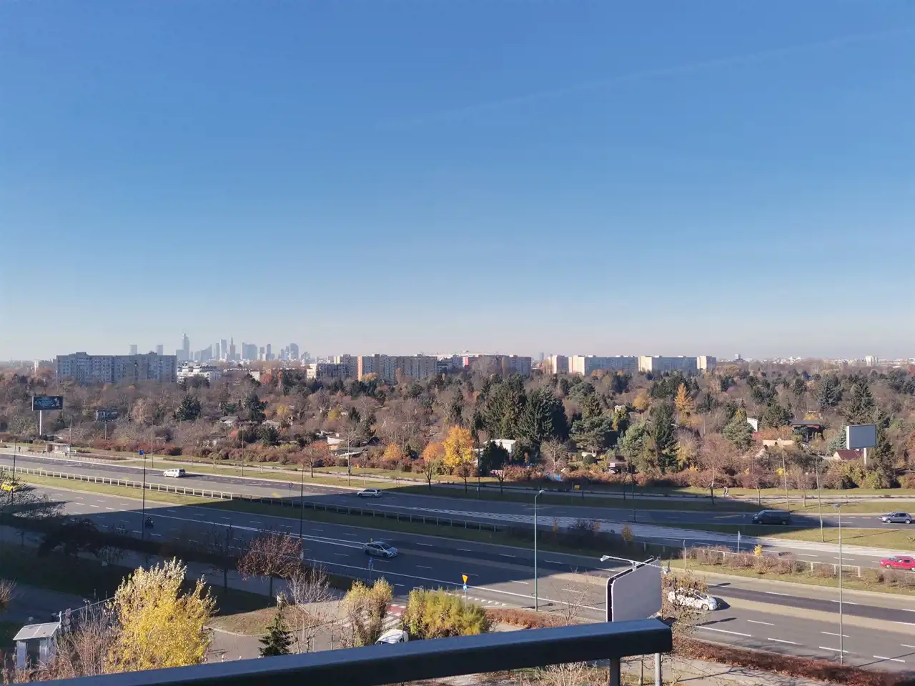 Pokoje umeblowane, większy z dwóch pokoi, dobrze nasłoneczniony z oknem na stronę południowo-zachodnią, znajdują się w nim nowe, nowoczesne meble fotele, stolik, witryny, szafka rtv, telewizor , wyjście na balkon. Widok na panoramę Warszawy