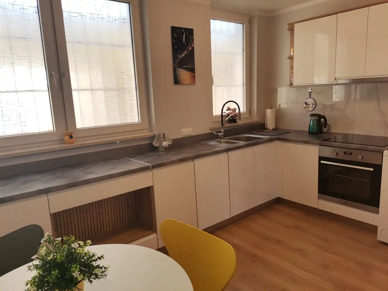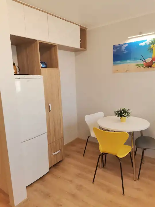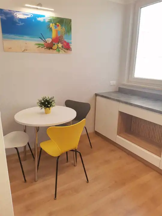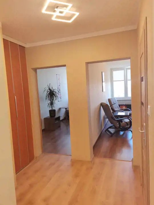 Kuchnia wyposażona w nowe sprzęty zmywarkę płytę elektryczną, lodówkę oraz zabudowę na wymiar, znajduje się w niej stół przy którym można spożywać posiłki. Sufitowe LED-y, oświetlenie punktowe przy strefach kuchennych i w łazience. Nowa aranżacja kuchni dodaje przestrzeni i nowoczesnego charakteru.