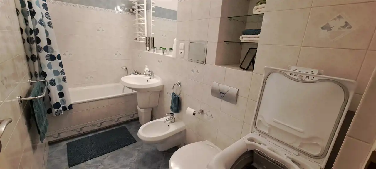 Całość uzupełnia zaskakująco duża łazienka z wanną i pralką.