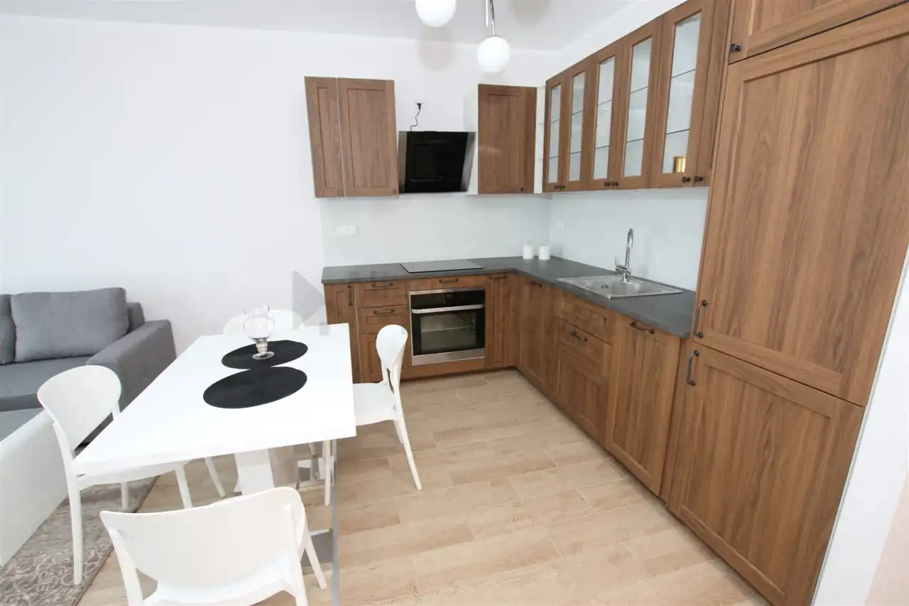 Aneks kuchenny - na podłodze gres, zabudowa meblami pod wymiar z AGD: lodówko-zamrażalka, zmywarka, piekarnik elektryczny, płyta indukcyjna i okap. Na wyposażeniu stół z 4 krzesłami.