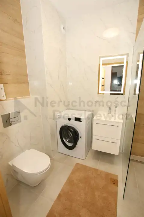 Łazienka 4.4m - gres, glazura, kabina prysznicowa, szafkoumywalka, wc i pralka.