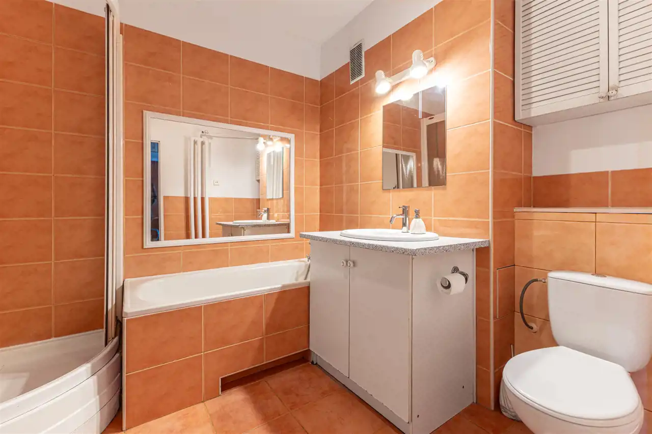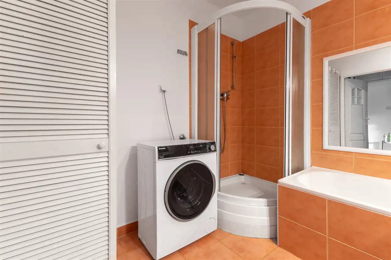 - Łazienka: kabina prysznicowa, wanna, umywalka, szafka, pralka, WC