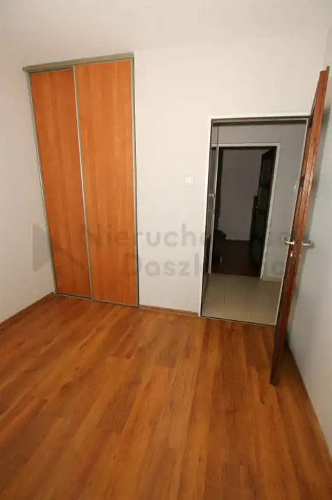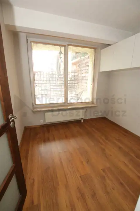 Pokój o pow. 8.6m (bez tradycyjnych okien, doświetlony światłem z przedpokoju poprzez mleczne szyby) - na podłodze panele podłogowe, szafa w stałej zabudowie.