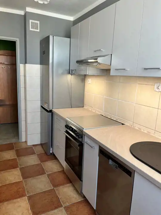 Kuchnia ma nowe umeblowanie i nowy sprzęt AGD jest też zmywarka.
