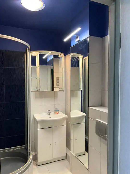 W łazience jest kabina prysznicowa, umywalka, w.c. oraz duża pralka.