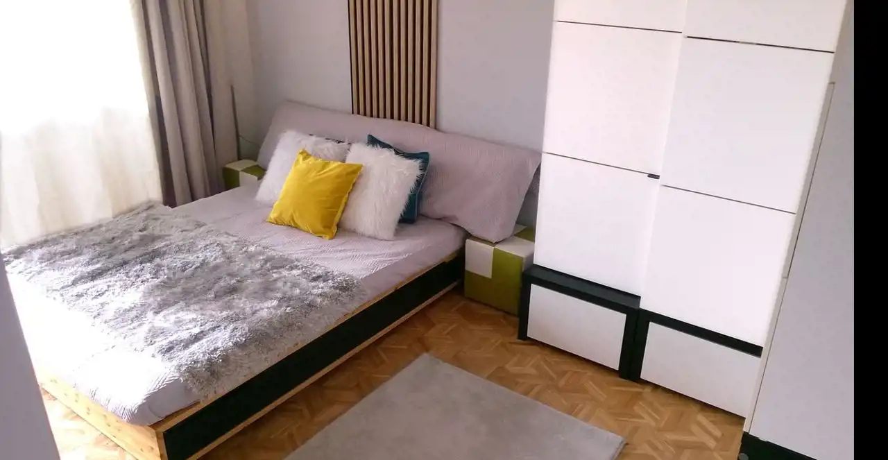 W sypialni znajduje się pojemna szafa oraz podwójne łóżko małżeńskie.
