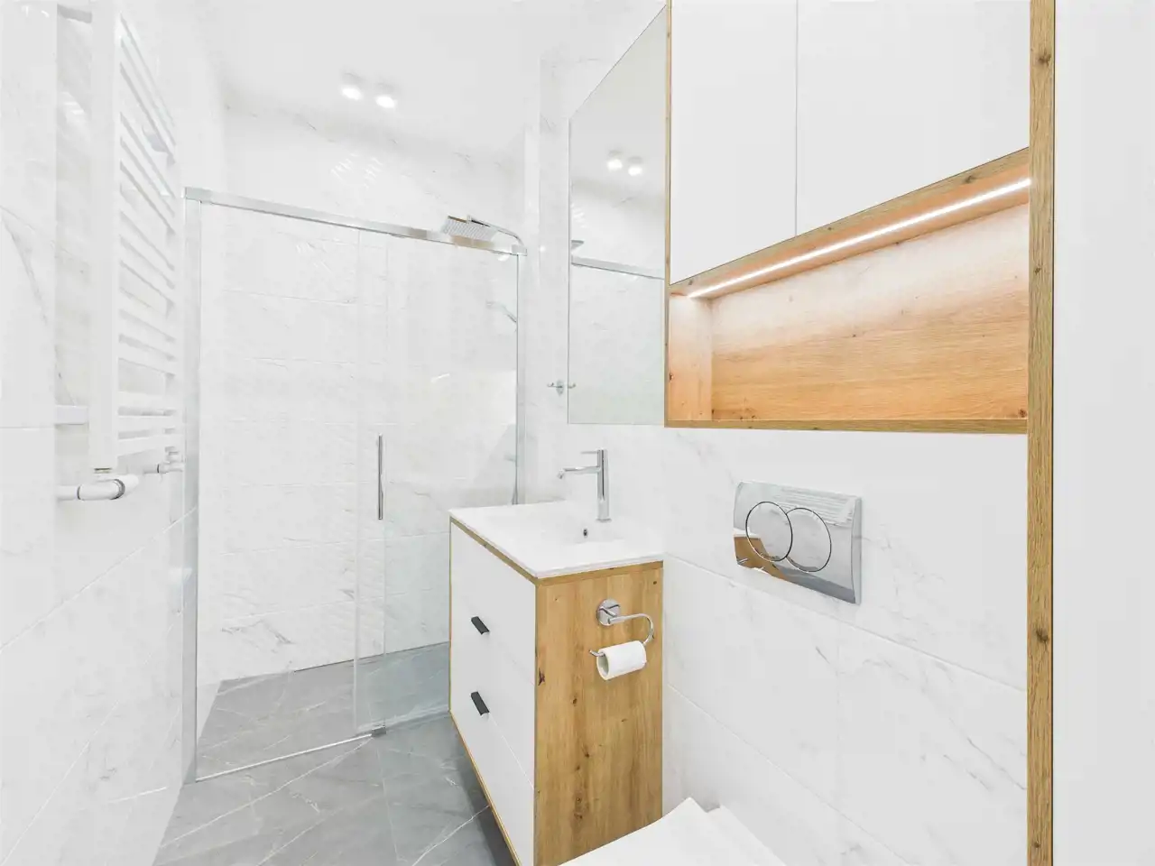 ✔ łazienka z kabiną walk-in z deszczownicą, szafka z umywalką, pralko-suszarka