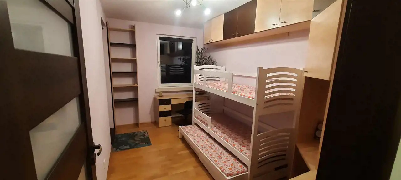 Dwie sypialnie każda po około 10m2 (jedna przystosowana dla dzieci - łóżko piętrowe; druga - duże łóżko). Łazienka wyposażona z wannę. W przedpokoju odnajdziemy szafę wnękowa. Mieszkanie jest wyposażone o gotowe do wprowadzenia. Do mieszkania przynależy loggia.