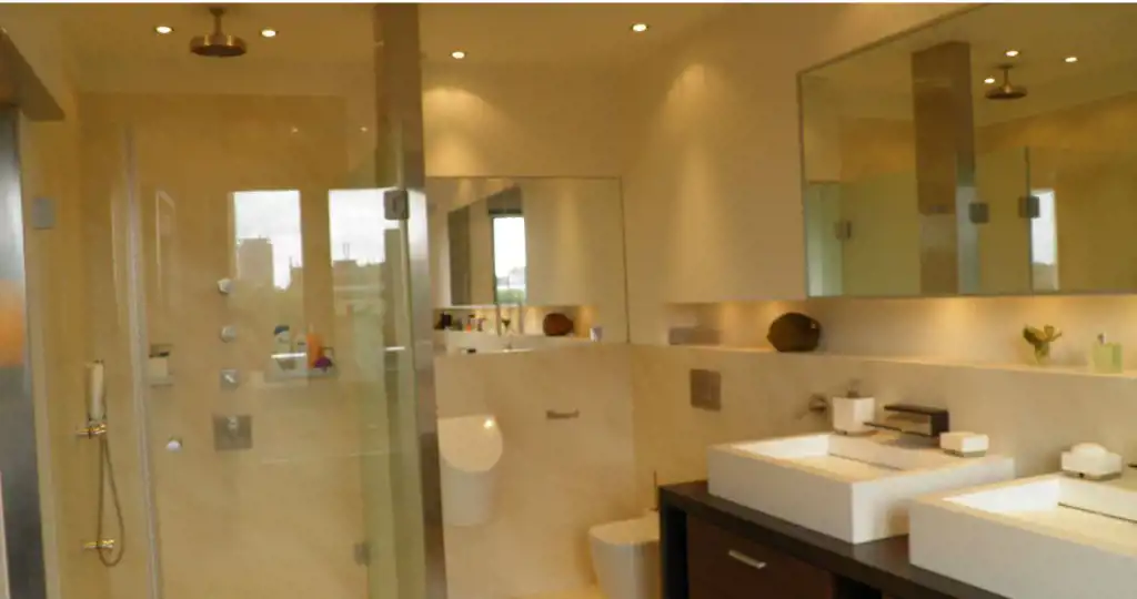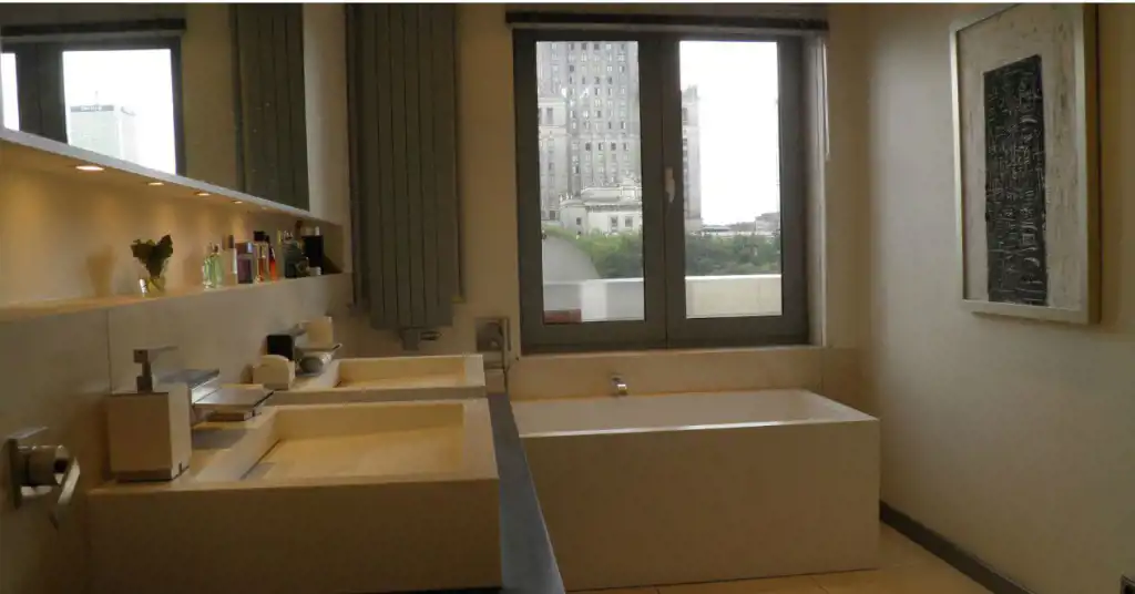 Duży, wygodny salon kąpielowy z oknem, z urządzeniami m.in. firmy Antonio Lupi.