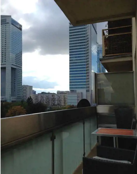 Balkon i okna ( wyciszające ) skierowane na południe z pięknym widokiem na Centrum Warszawy i Pałac Kultury.