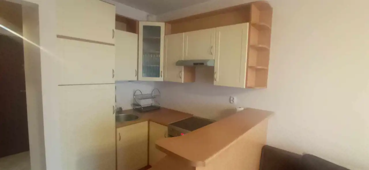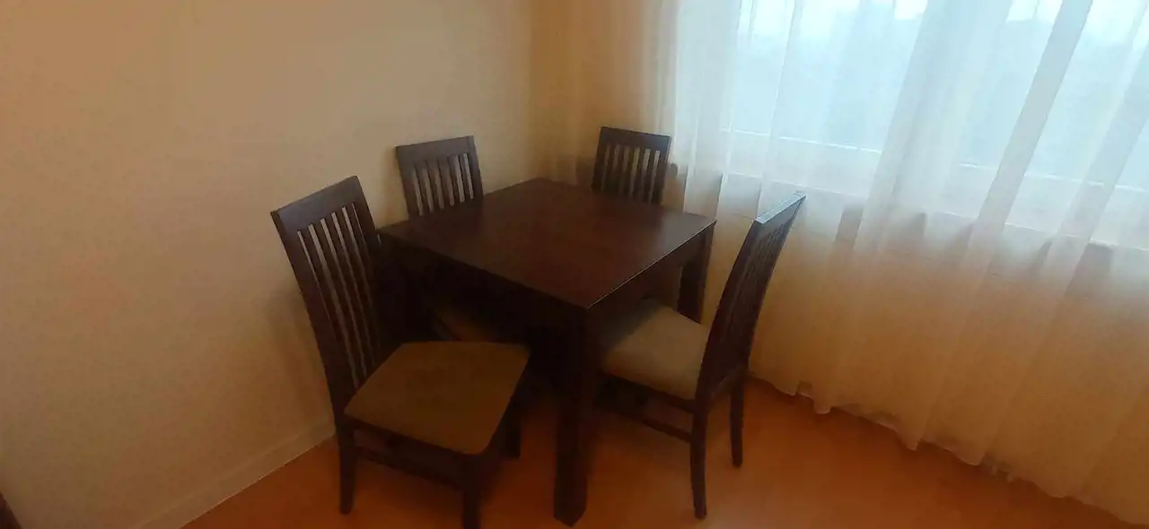 Salon wyposażony jest w wersalkę, stół z krzesłami oraz komodę, kuchnia z indukcją ,w sypialni wbudowana szafa wnękowa.