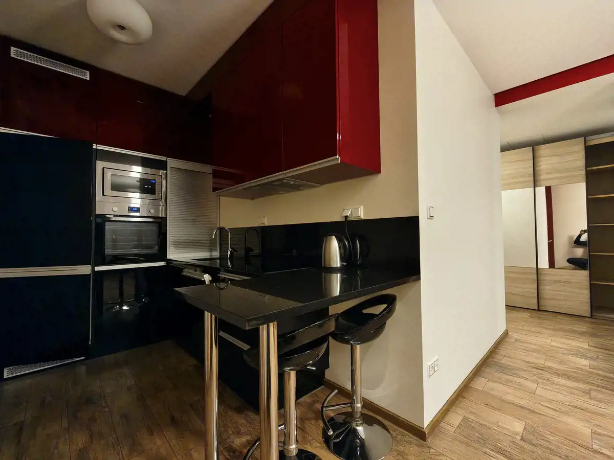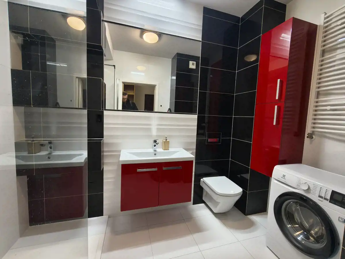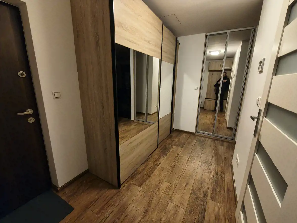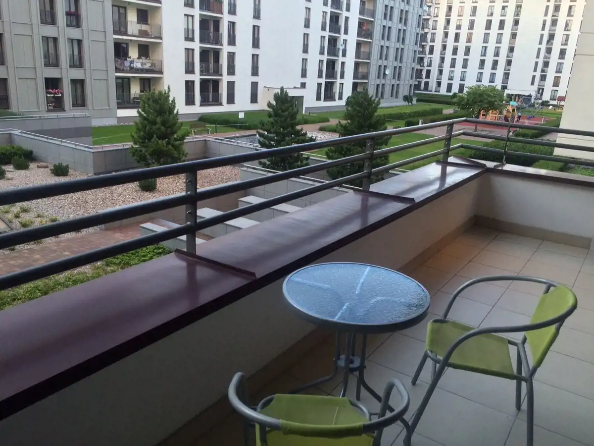 Mieszkanie składa się z: sypialni (wygodne dwuosobowe łóżko 140cm, komoda, szafka nocna), salonu (skórzany narożnik, stół, TV) połączonego z kuchnią (pełne wyposażenie: piekarnik, płyta indukcyjna, lodówka, zmywarka, mikrofalówka, czajnik, przybory kuchenne), dużej łazienki (prysznic z deszczownicą walk - in, pralka, szafki), przestronnego przedpokoju (2 pojemne szafy, szafka na buty, wieszak) oraz dużej (10m2) dwustronnej loggi z widokiem na wewnętrzne zaciszne i rozległe patio z ogrodem i fontanną. Mieszkanie w pełni umeblowane i wyposażone.
