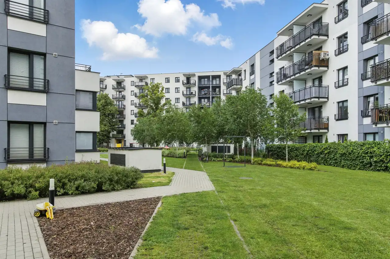Teren zamknięty , chroniony z własnym patio. Cała infrastruktura na miejscu, doskonały dojazd do centrum.