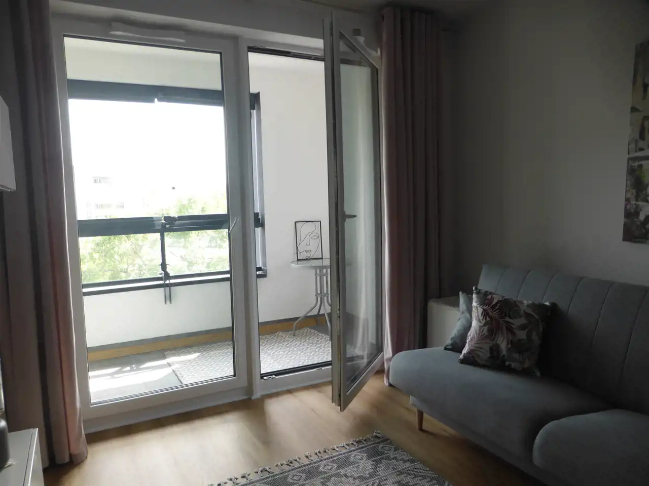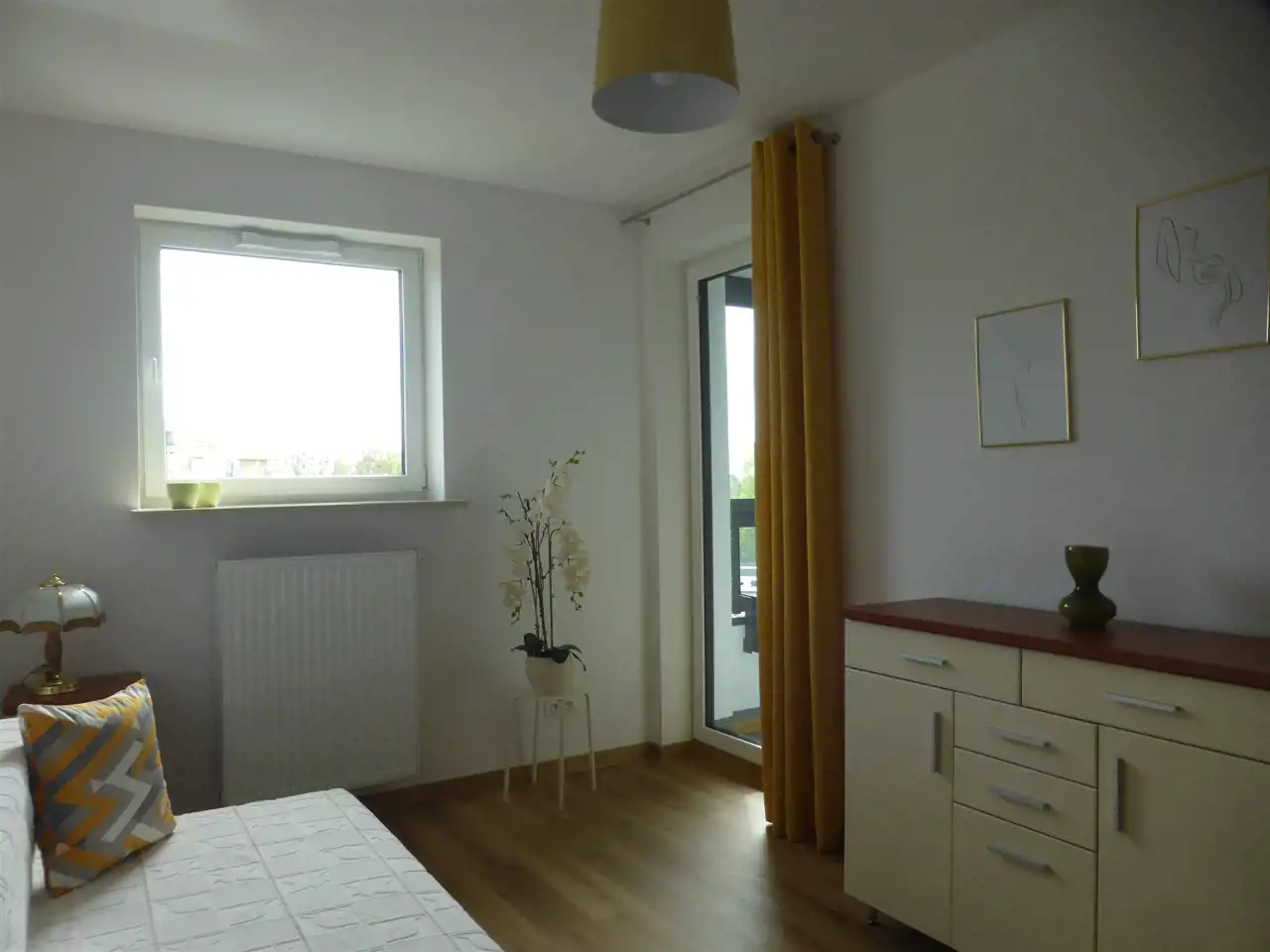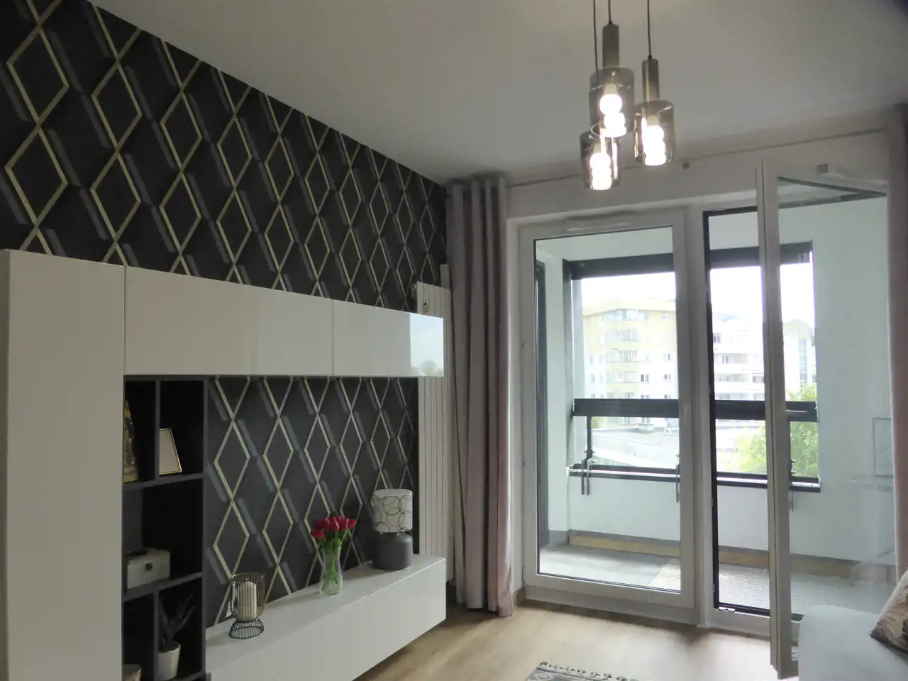 Mistrzowsko zaprojektowany apartament o powierzchni 44,23m2 i wysokości 2,65m . Mistrzowsko, ponieważ udało się w nim pomieścić nawet osobne pomieszczenie na garderobę [2,25m], zatem szafy są zbędne. Obszerny hol [5,41m] prowadzi na lewo do cudownej łazienki z prysznicem, umywalką i WC oraz pralką. Pokój dzienny z aneksem kuchennym [18,26] z wielkimi, trzyszybowymi drzwiami na zabudowaną bezpiecznym szkłem loggie [3,3m]. Orientacja południowo-wschodnia sypialni i salonu. W przeciwległym do loggii końcu, kuchnia z barem wyposażona w potrzebne sprzęty AGD wraz ze zmywarką [szerokość 40cm]. Sypialnia [13,47m] UWAGA: z drzwiami na loggie, dodatkowo jeszcze okno.
