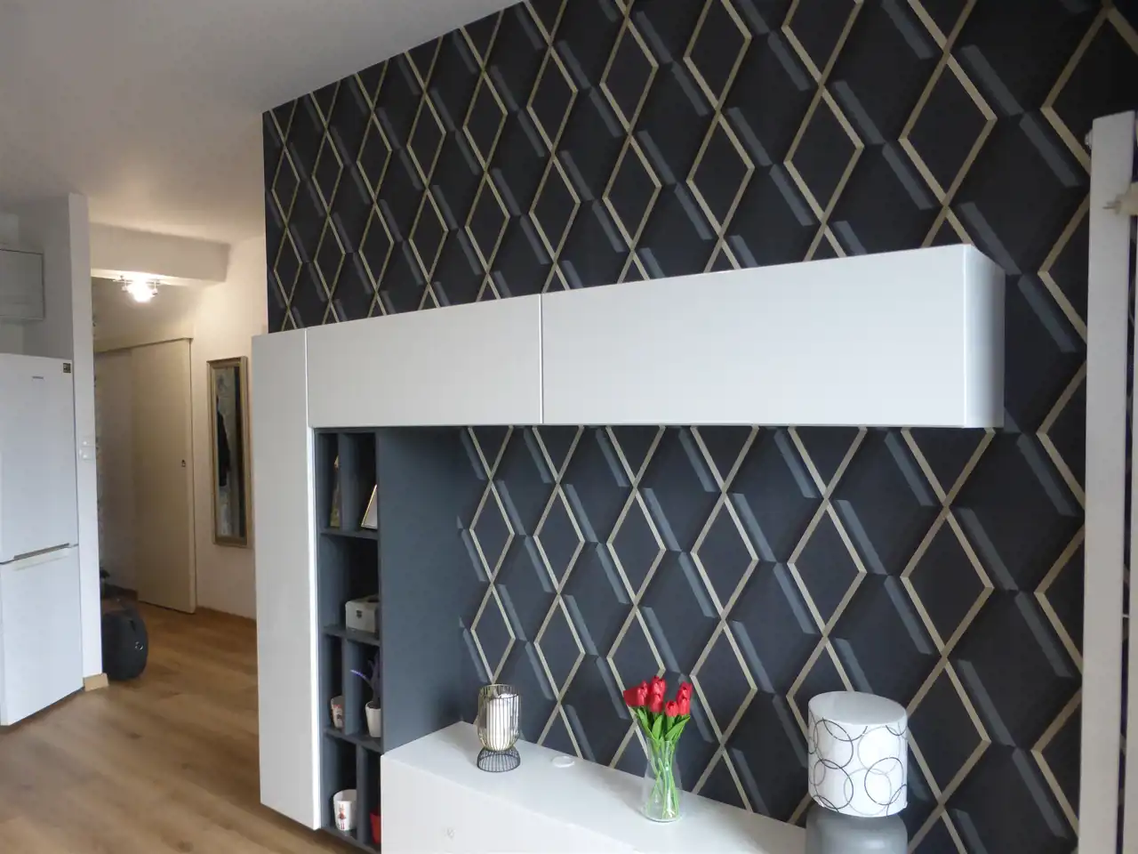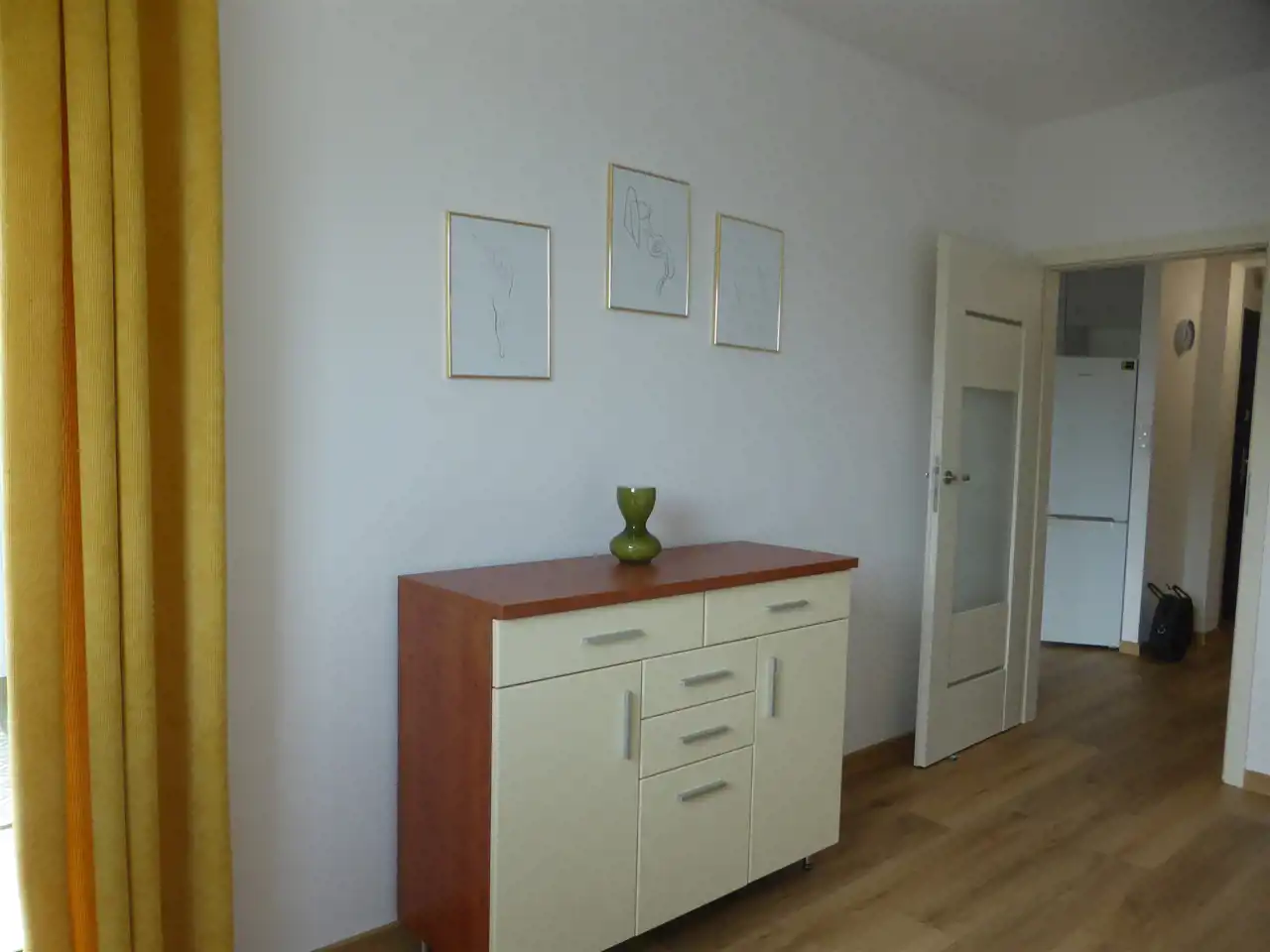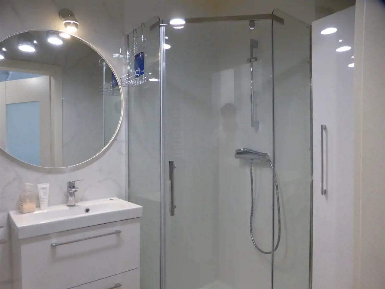 Mistrzowsko zaprojektowany apartament o powierzchni 44,23m2 i wysokości 2,65m . Mistrzowsko, ponieważ udało się w nim pomieścić nawet osobne pomieszczenie na garderobę [2,25m], zatem szafy są zbędne. Obszerny hol [5,41m] prowadzi na lewo do cudownej łazienki z prysznicem, umywalką i WC oraz pralką. Pokój dzienny z aneksem kuchennym [18,26] z wielkimi, trzyszybowymi drzwiami na zabudowaną bezpiecznym szkłem loggie [3,3m]. Orientacja południowo-wschodnia sypialni i salonu. W przeciwległym do loggii końcu, kuchnia z barem wyposażona w potrzebne sprzęty AGD wraz ze zmywarką [szerokość 40cm]. Sypialnia [13,47m] UWAGA: z drzwiami na loggie, dodatkowo jeszcze okno.