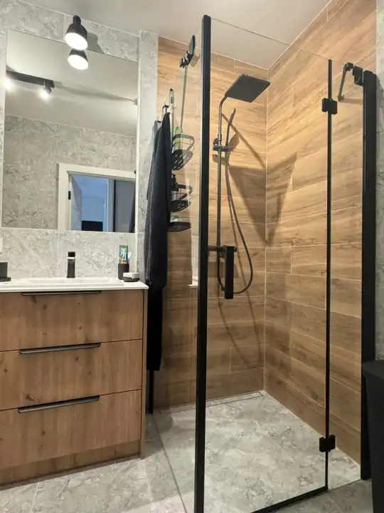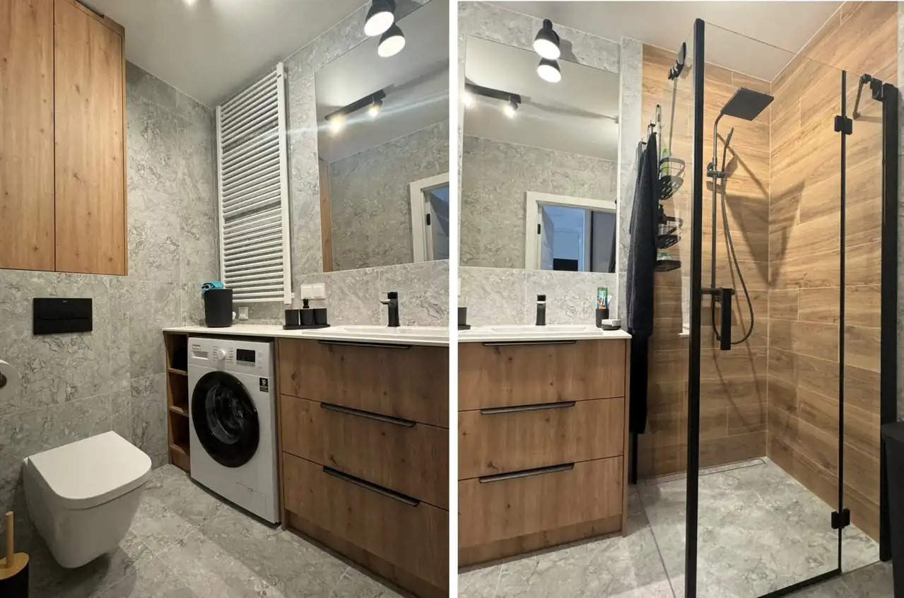 -Łazienka: wyposażona w kabinę prysznicową, pralkę, umywalkę oraz WC.